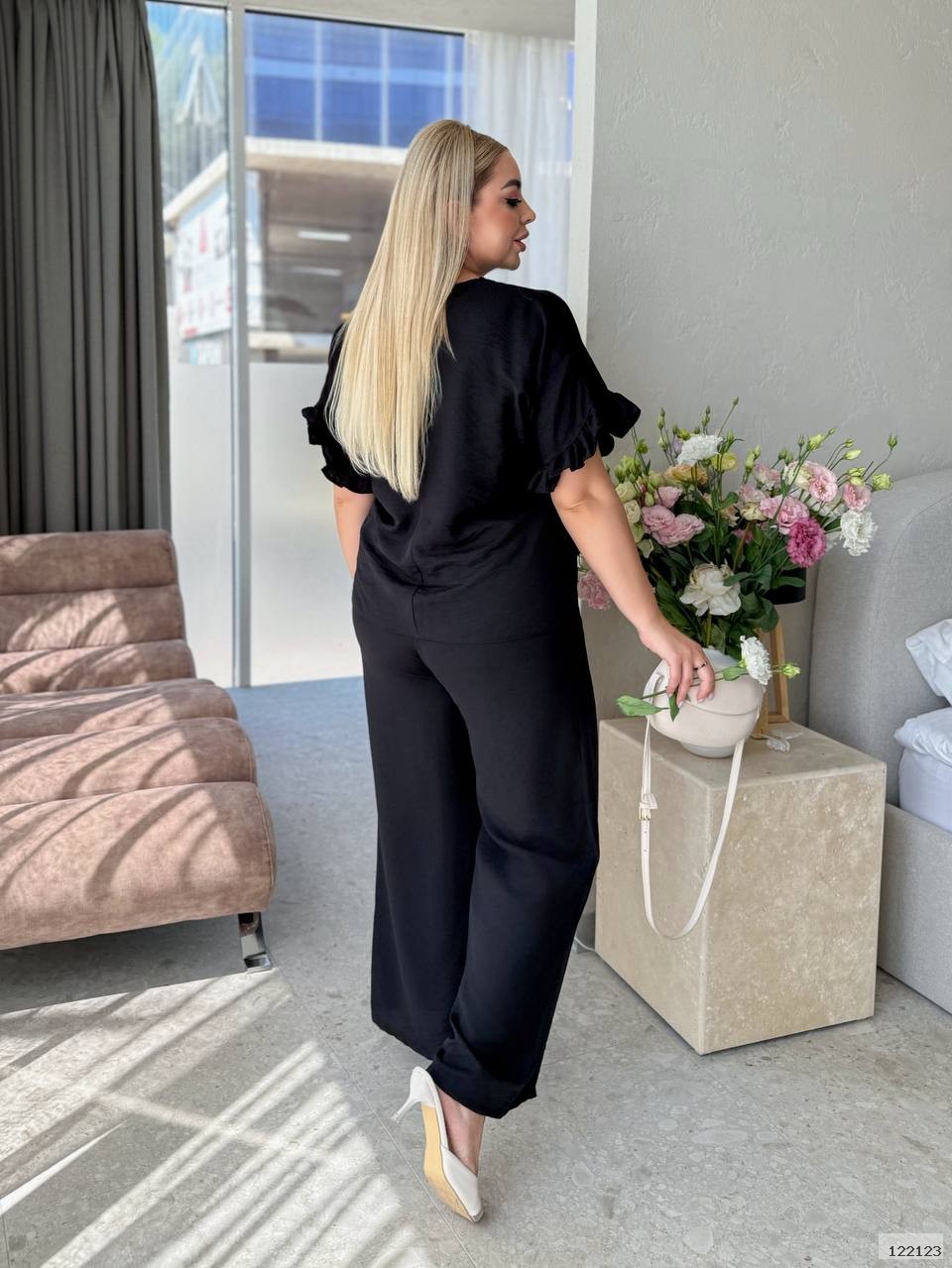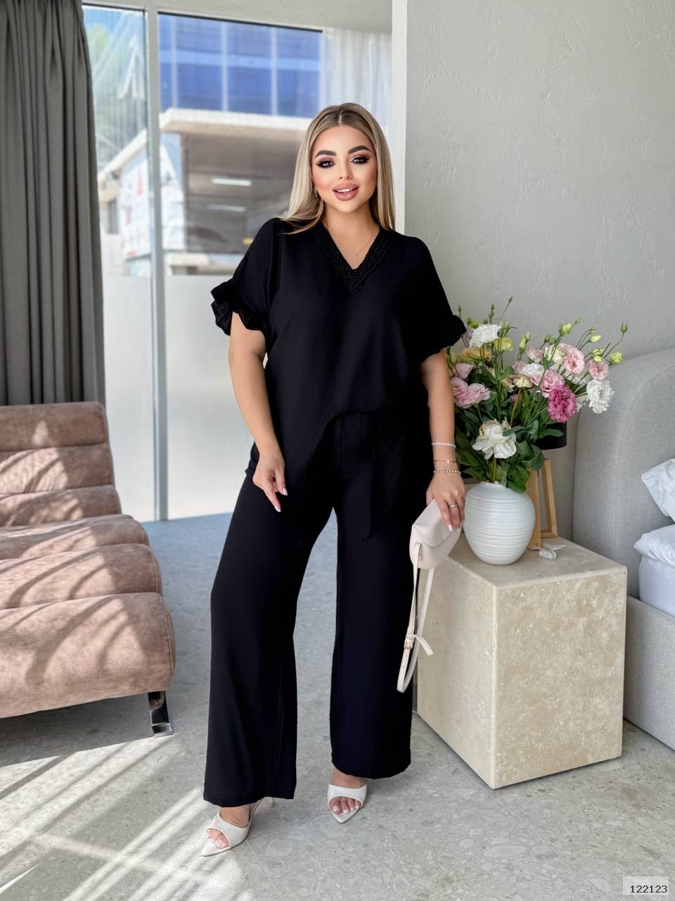 Горловина обшита мереживом; на рукаві стильні рюші; в переді є завʼязка, що дозволяє зібрати під себе кофтинку саме так як вам буде до вподоби; штани в стилі палаццо не надто широкі і достатньо довгі; пояс на резинці