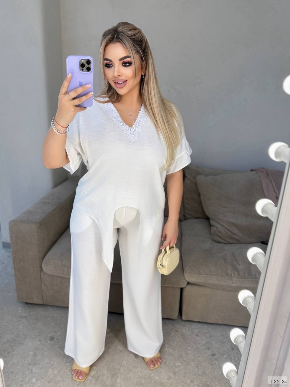 Горловина обшита мереживом; на рукаві стильні рюші; в переді є завʼязка, що дозволяє зібрати під себе кофтинку саме так як вам буде до вподоби; штани в стилі палаццо не надто широкі і достатньо довгі; пояс на резинці