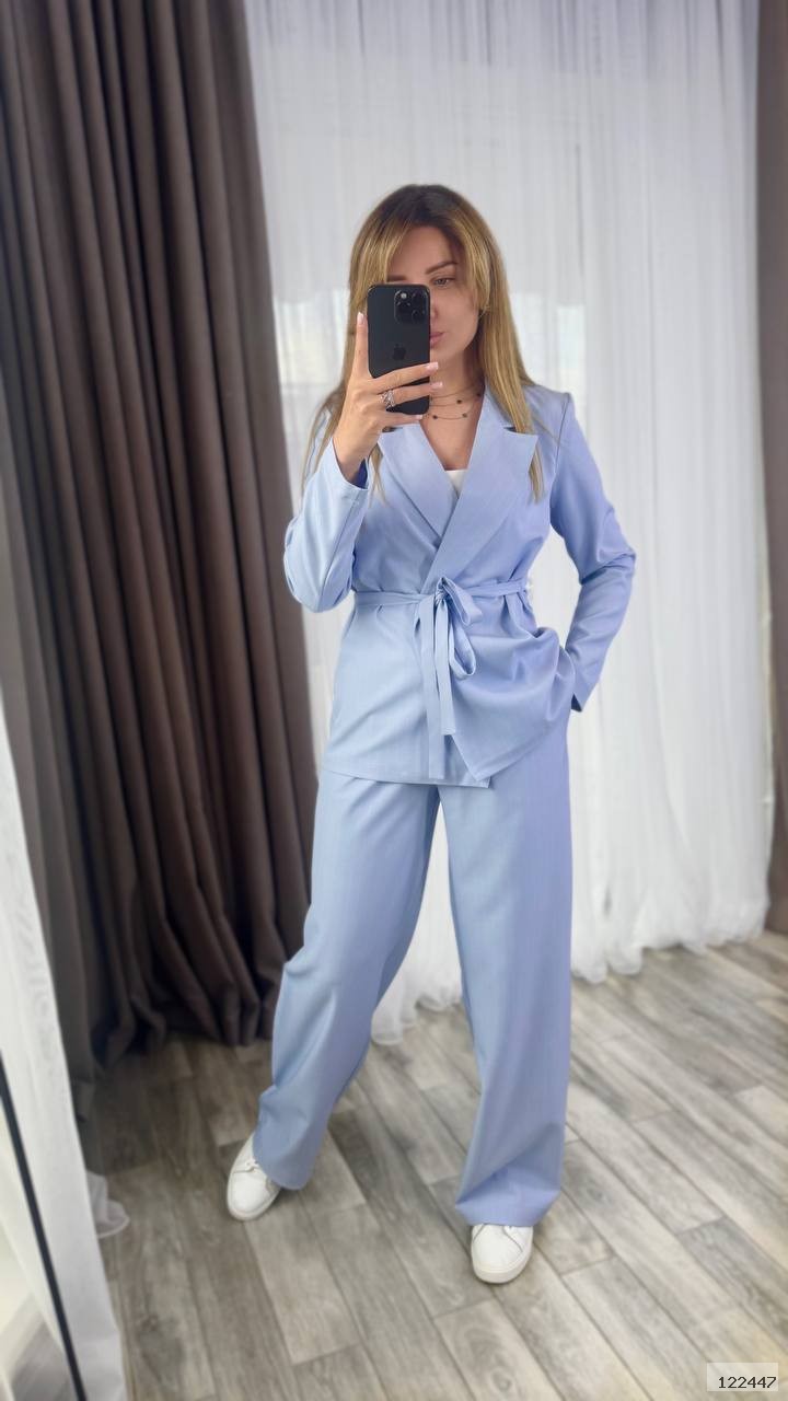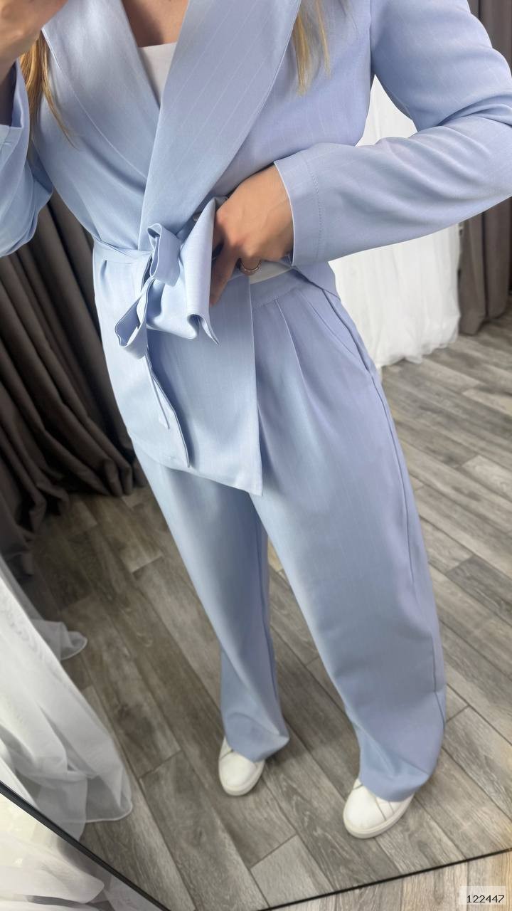Костюм жакет без підкладу, на запах, пояс пришитий. Штани посадка середня, вільного крою, позаду на талії резинка, застібаються на блискавку та пуговицю
