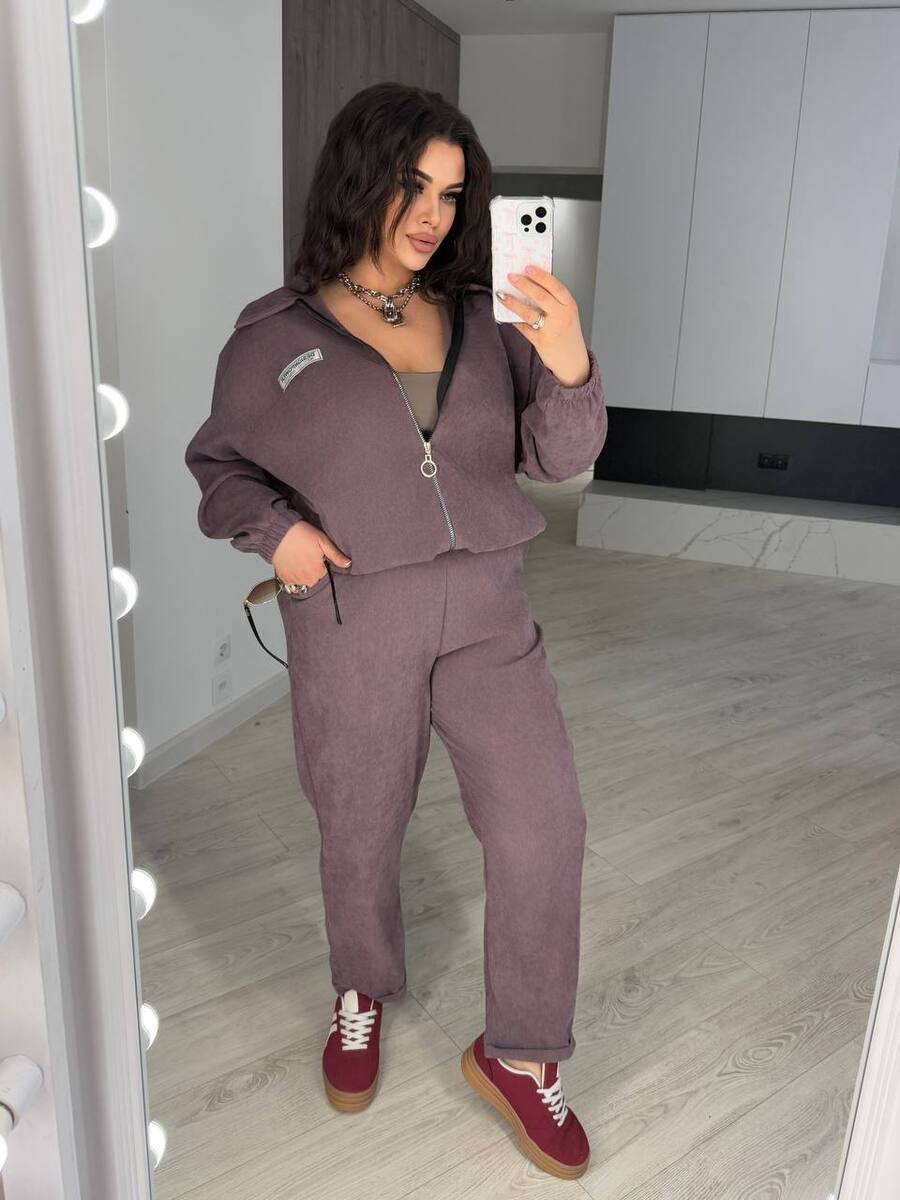 Кофтина зі спущеними рукавами, застібаеться на блискавку, низ регулюється кулискою. Як завжди зручні кишені та привабливий комірець.Брюки універсальні, трохи завужені до низу, мають дві кишені, єластичний пояс теж регулюються кулискою. І як завжди з гарною посадкою. Пасує до будь якої сітуації, окрім того дуже комфортний.
