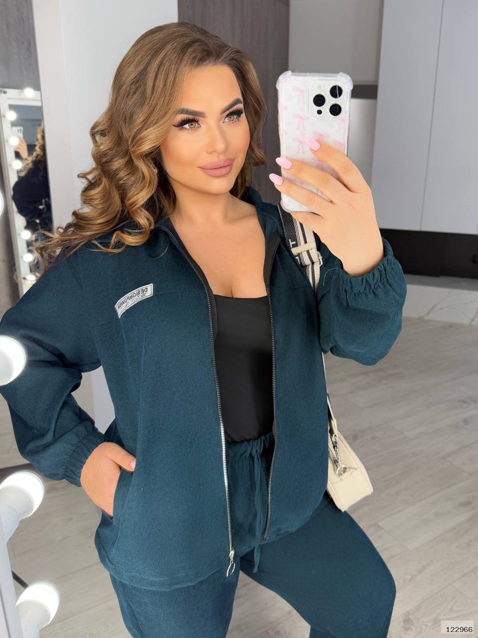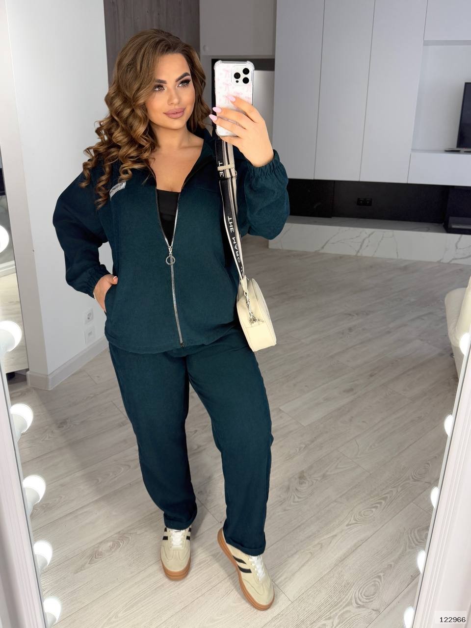 Кофтина зі спущеними рукавами, застібаеться на блискавку, низ регулюється кулискою. Як завжди зручні кишені та привабливий комірець.Брюки універсальні, трохи завужені до низу, мають дві кишені, єластичний пояс теж регулюються кулискою. І як завжди з гарною посадкою. Пасує до будь якої сітуації, окрім того дуже комфортний.
