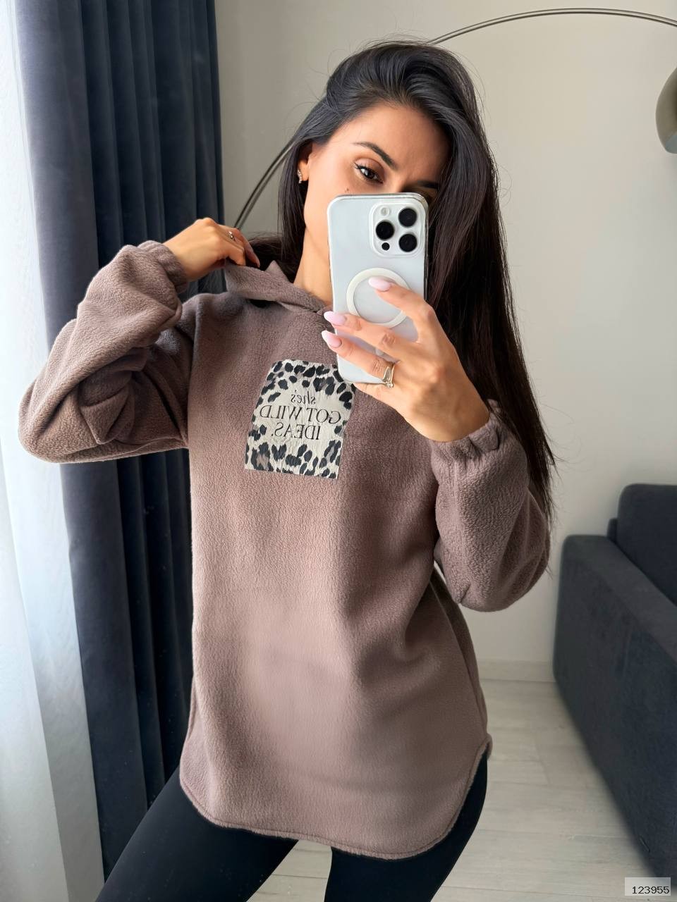 Стильний, зручний та дуже м’який комплект для осені та зими. Складається з подовженої кофти з капюшоном і лосінів. Комфортний у повсякденному носінні, підходить як для дому, так і для прогулянок.