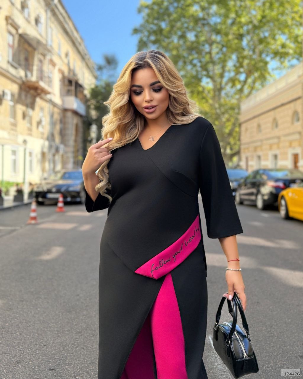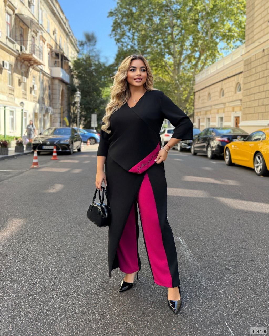 Штани з двоколірним ефектом та оригінальним кроєм, візуально робить стрункішою. Еластичний пояс на талії зручно фіксує посадку.