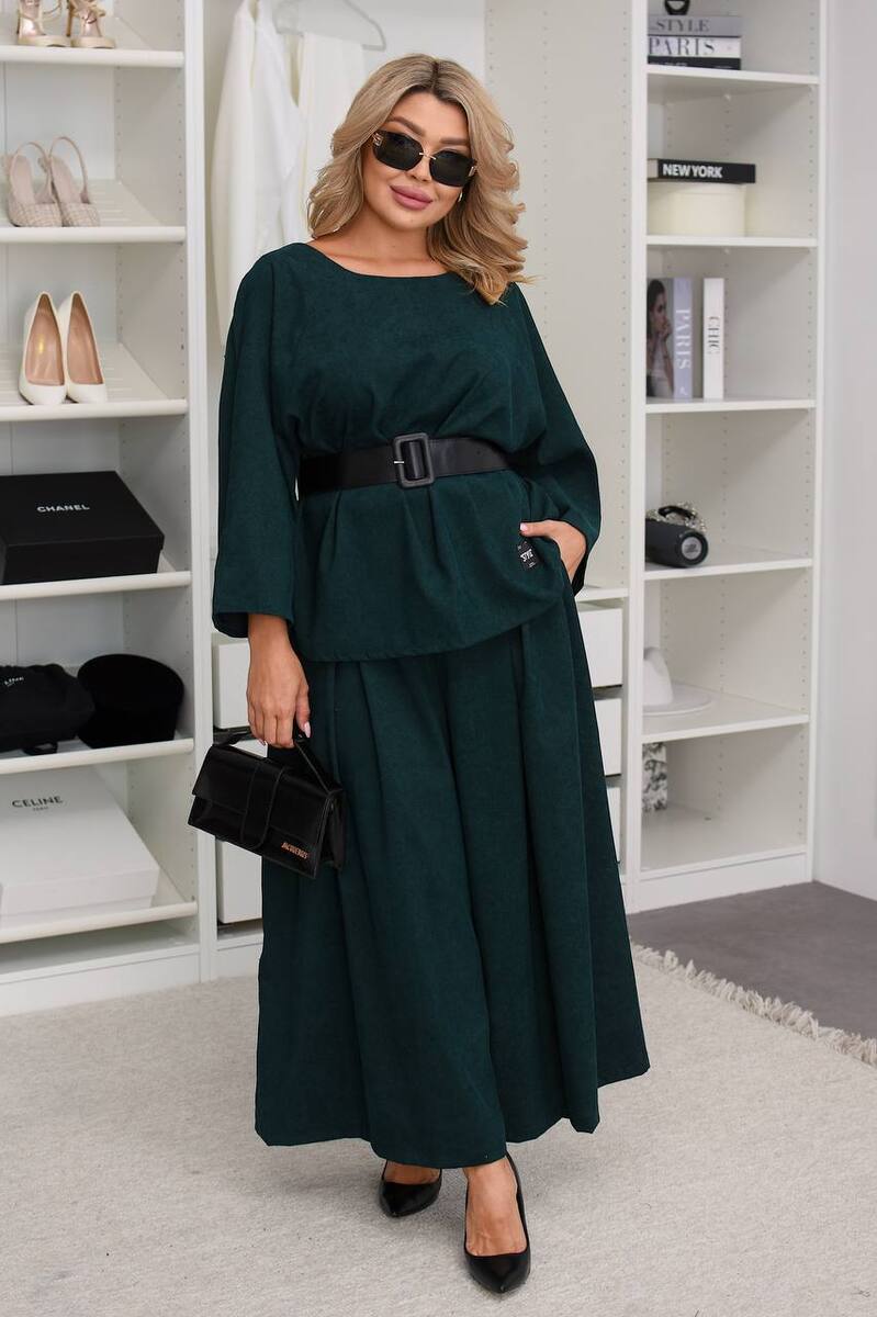 Костюм складається з двох предметів – вільного верху та широких штанів. Верх: це простора туніка із прямим кроєм та рукавами 3/4. Вона доповнена чорним ременем на талії з широкою пряжкою, що підкреслює силует і створює баланс між об'ємним верхом та фігурою.