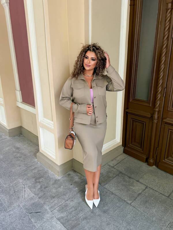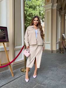 Сттильний костюм двійка, який складається зі спідниці олівець і бомбера.