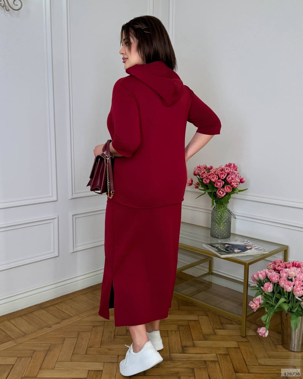 Кофта вільного крою забезпечує максимальний комфорт, має практичний капюшон та оригінальний принт, що додає образу легкості та жіночності. Спідниця прямого силуету з еластичним поясом гарно сідає по фігурі, не сковує рухів та підкреслює силует. Збоку передбачений розріз для зручності та додаткового шарму.