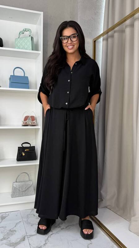 КОСТЮМ сорочка зі спідницею-брюки модний тренд сезону додає жіночності та елегантності образу. Вільний крій та висока талія частково на гумці. Косі кишені в бічних швах. Сорочка зі спущеним плечем довжина рукава 7/8 , сорочка вільного крою з затяжкою по переду.