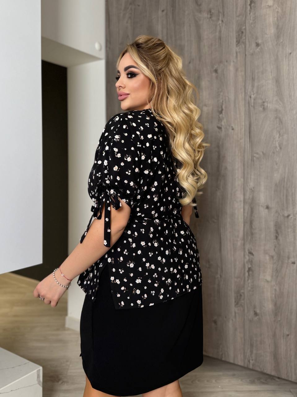 Тканина дуже приємна на дотик, не мнеться. Тканина щільна, нічого не просвічується. Зручний фасон блузи, нічого не перетискає, гарно виглядає і без ремінця. На рукавчиках зав’язки, можна регулювати під потрібний об’єм руки.