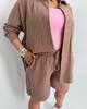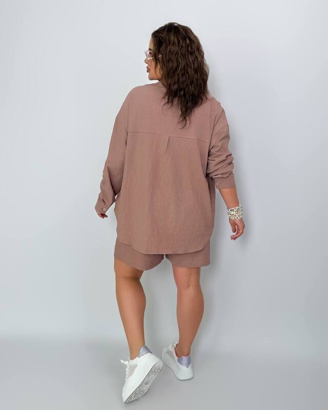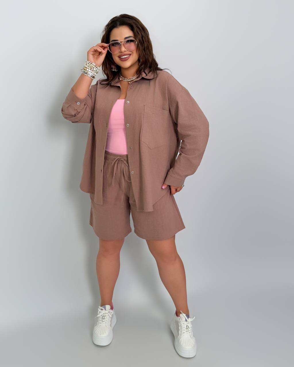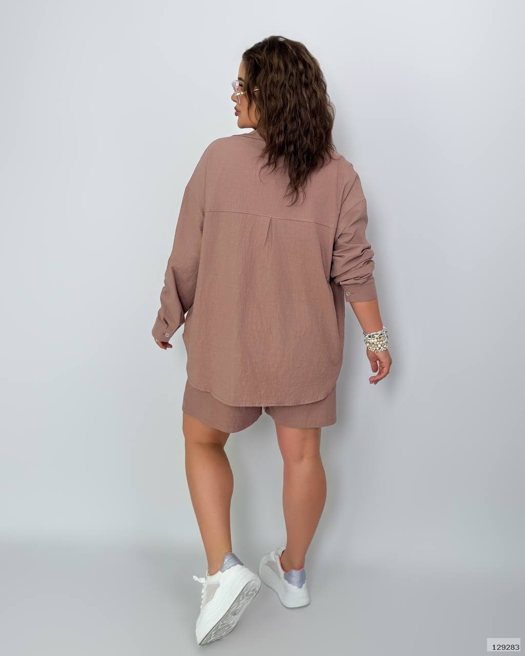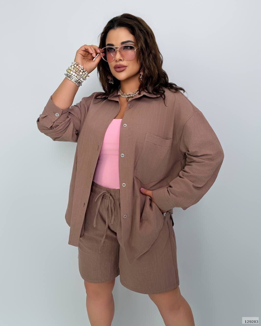Костюм із жатого льону: сорочка на ґудзиках з карманом + шорти з кишенями у бічних швах з посадкою вище середнього на еластичній гумці та куліскою на поясі