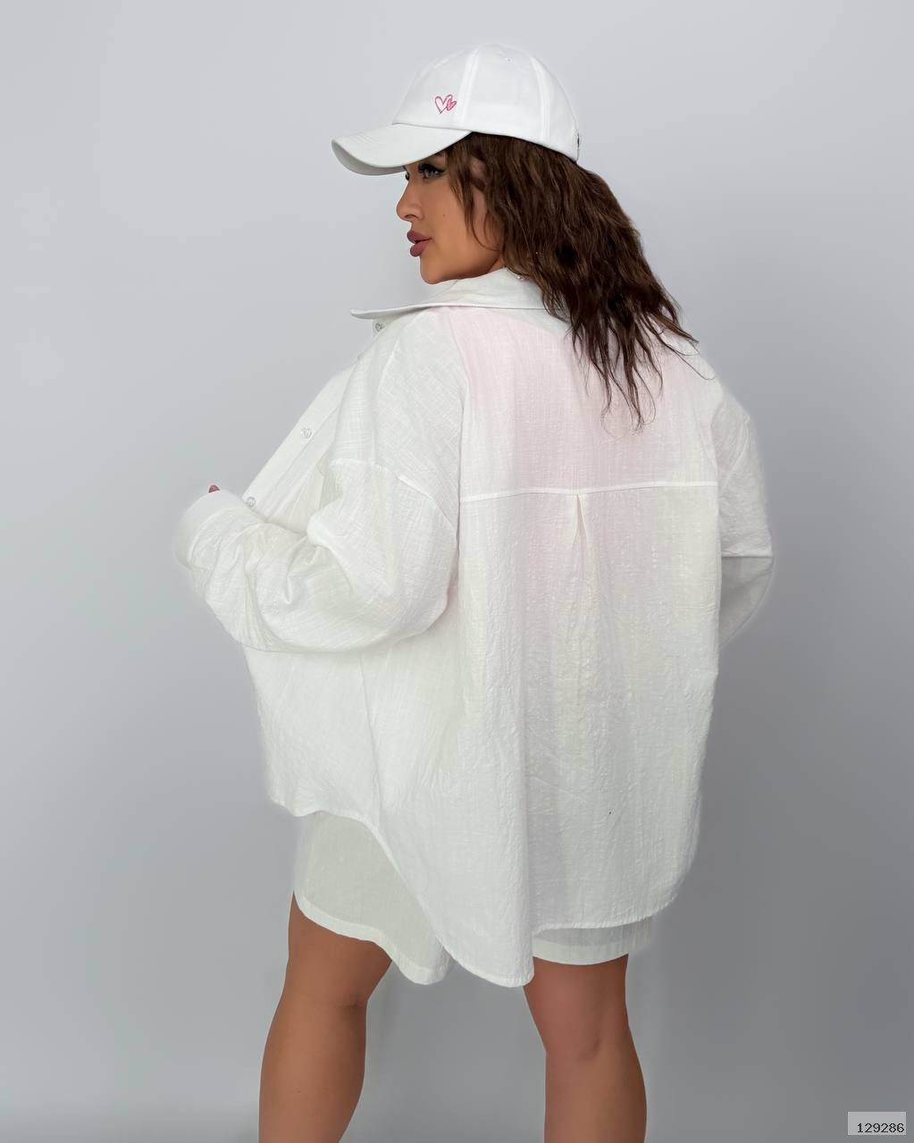 Костюм із жатого льону: сорочка на ґудзиках з карманом + шорти з кишенями у бічних швах з посадкою вище середнього на еластичній гумці та куліскою на поясі