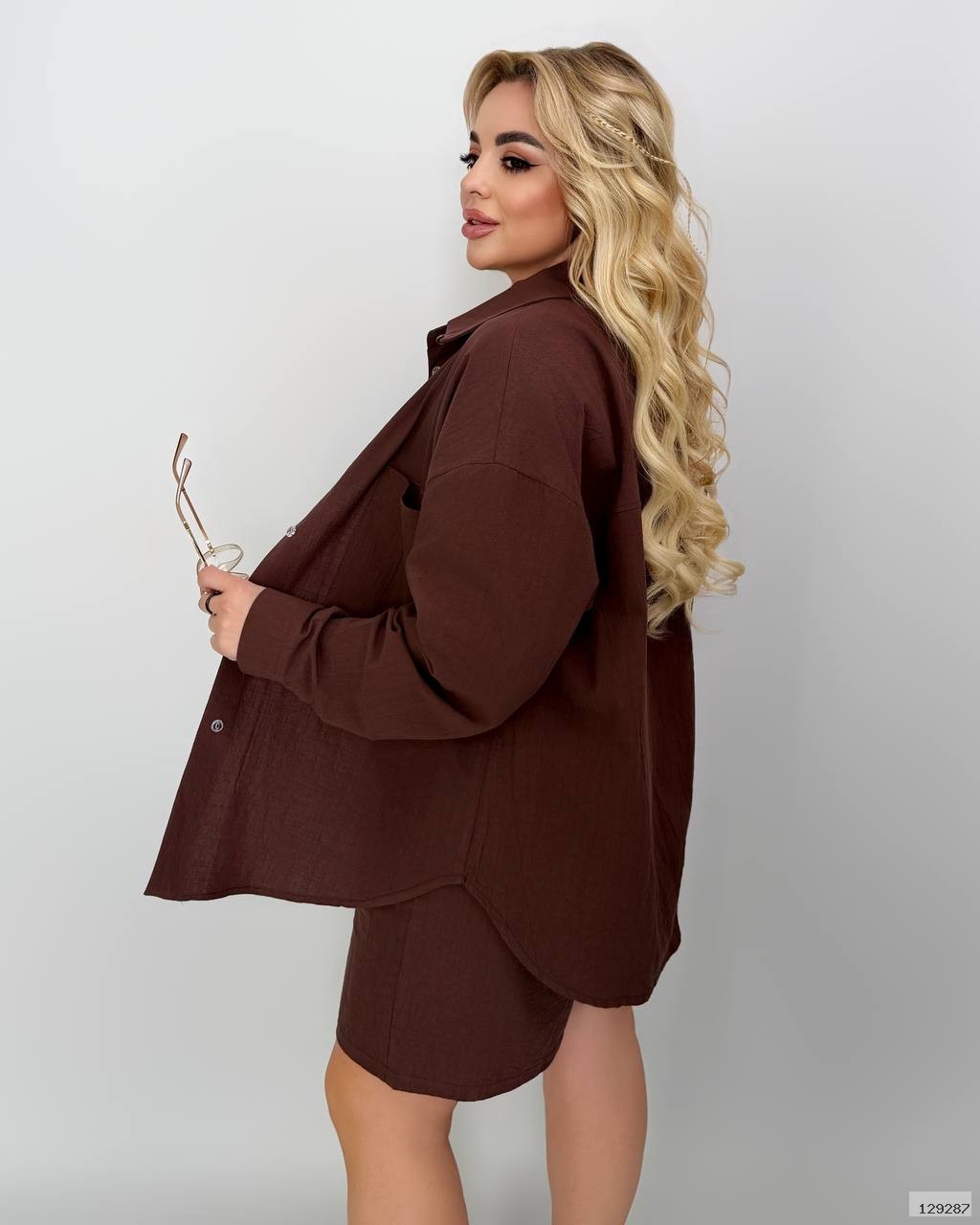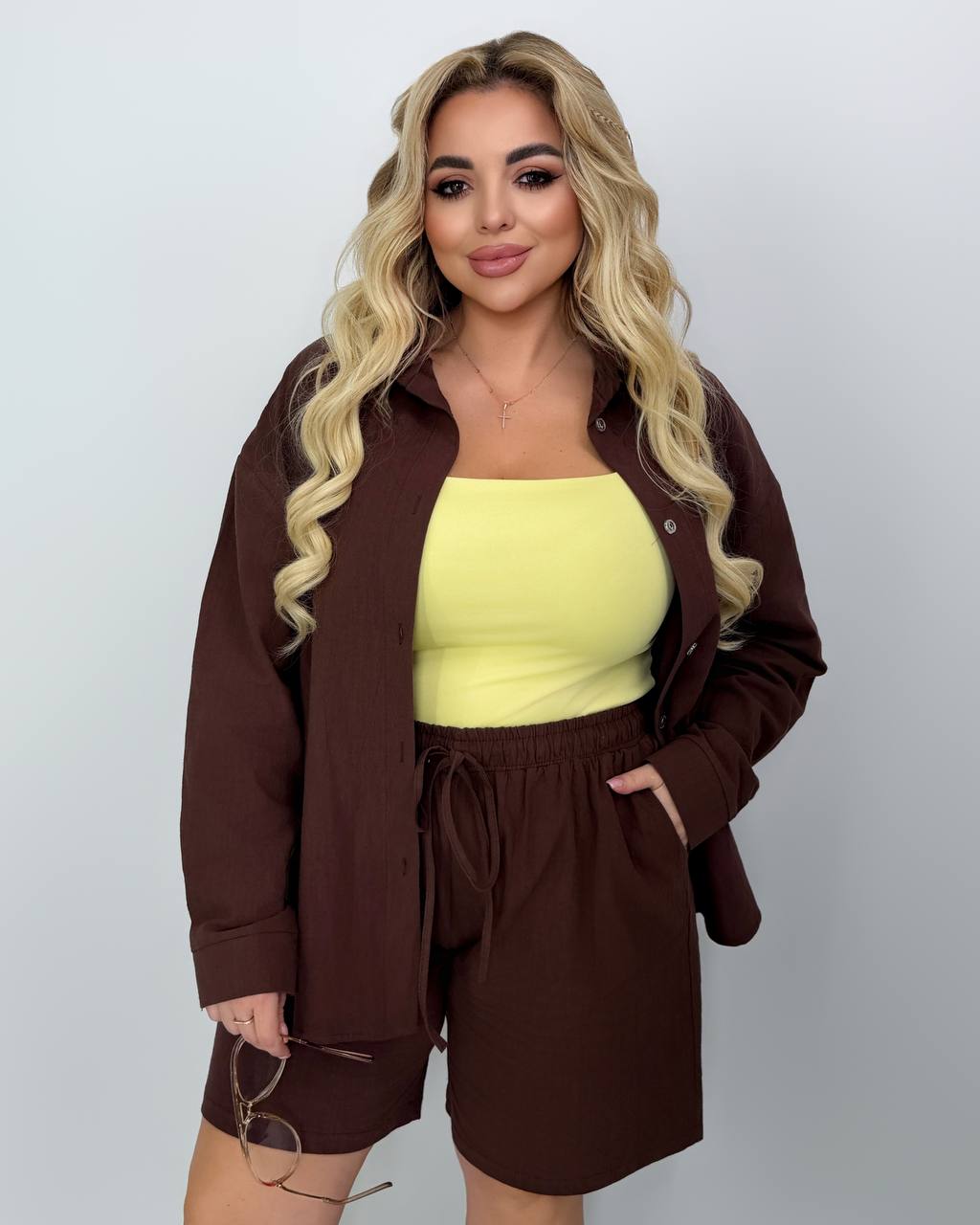 Костюм із жатого льону: сорочка на ґудзиках з карманом + шорти з кишенями у бічних швах з посадкою вище середнього на еластичній гумці та куліскою на поясі