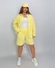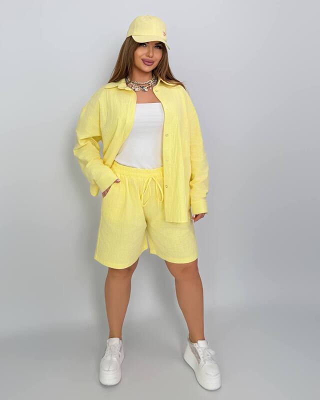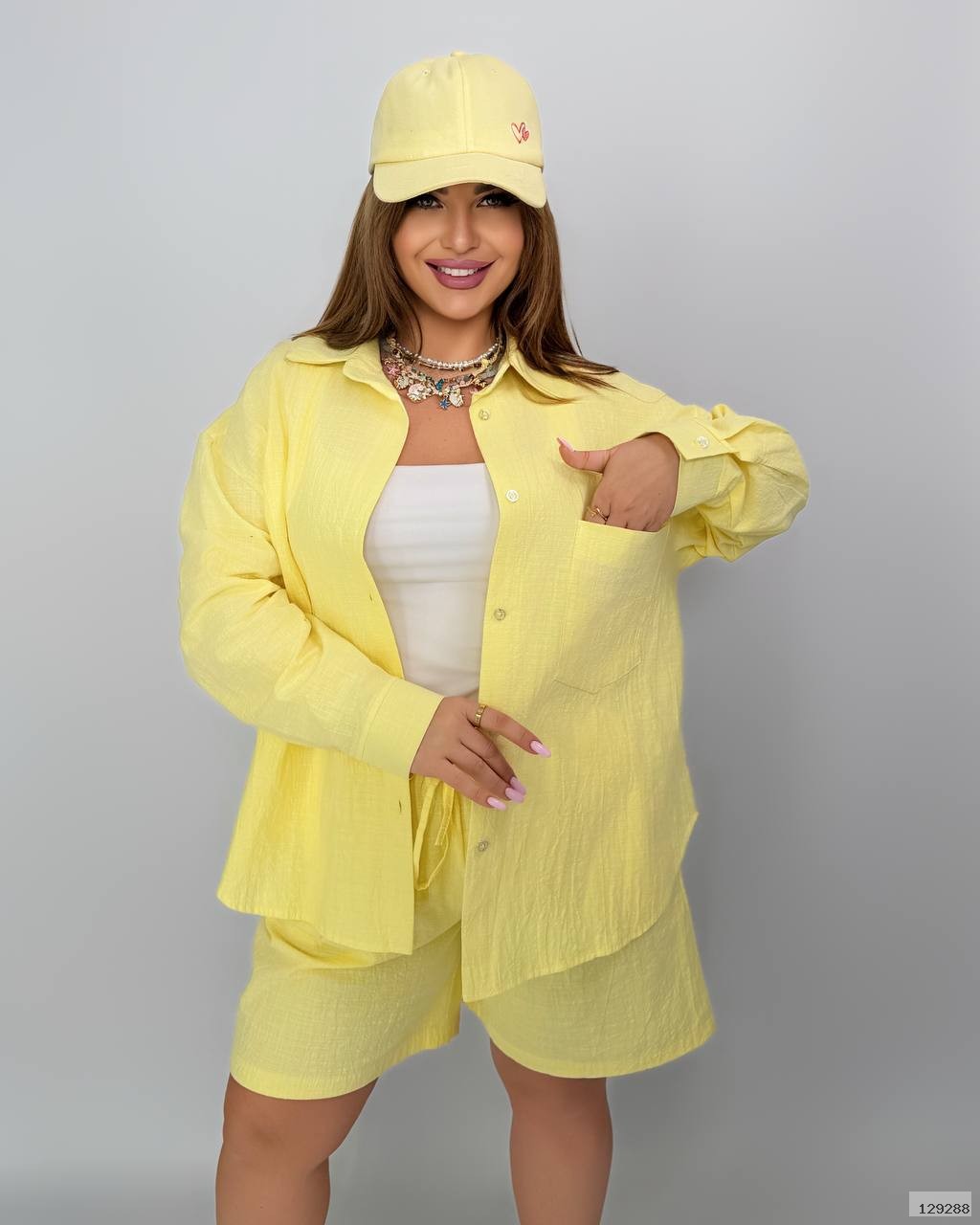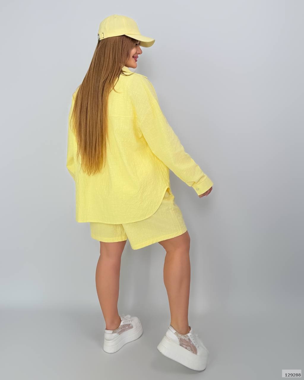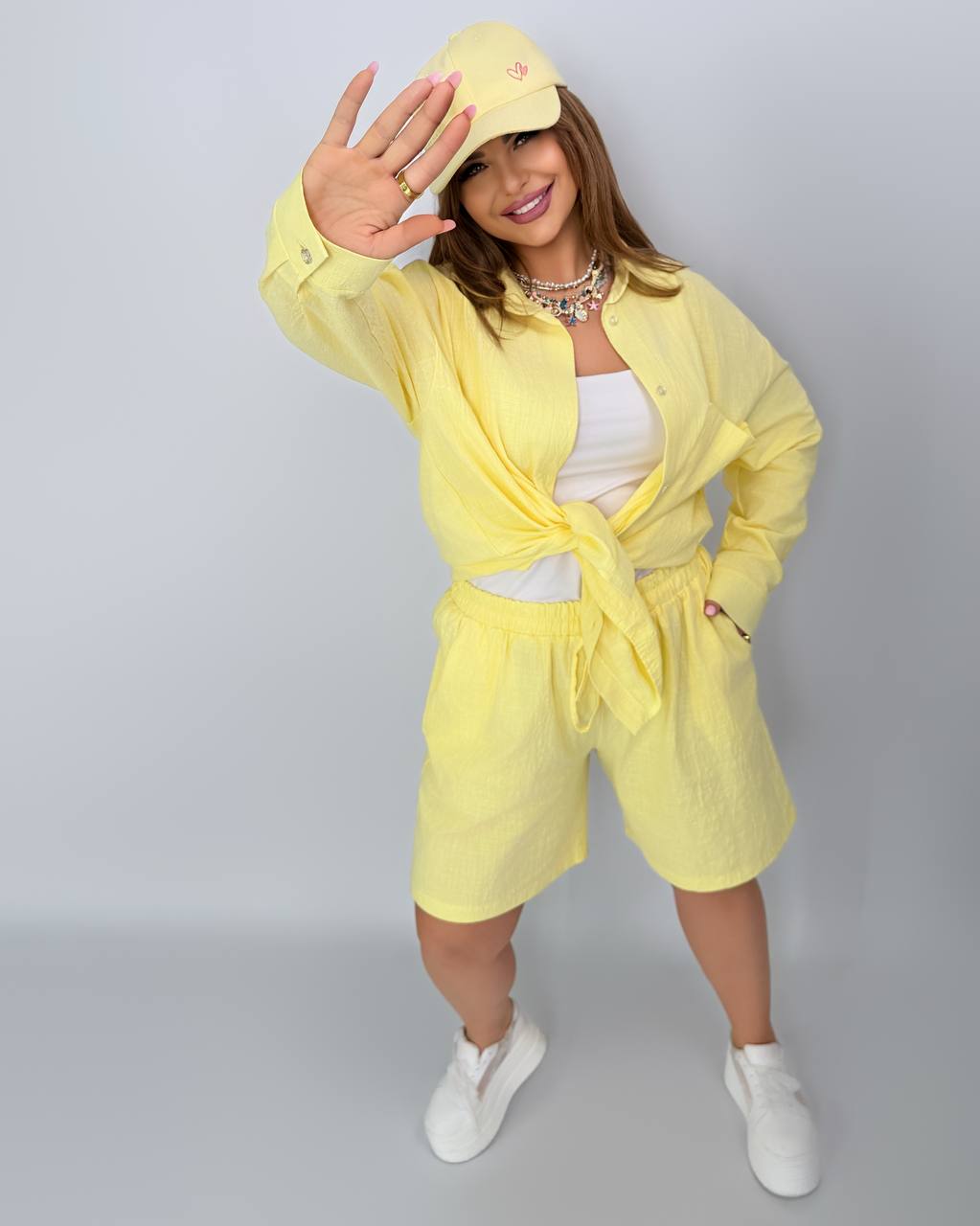 Костюм із жатого льону: сорочка на ґудзиках з карманом + шорти з кишенями у бічних швах з посадкою вище середнього на еластичній гумці та куліскою на поясі