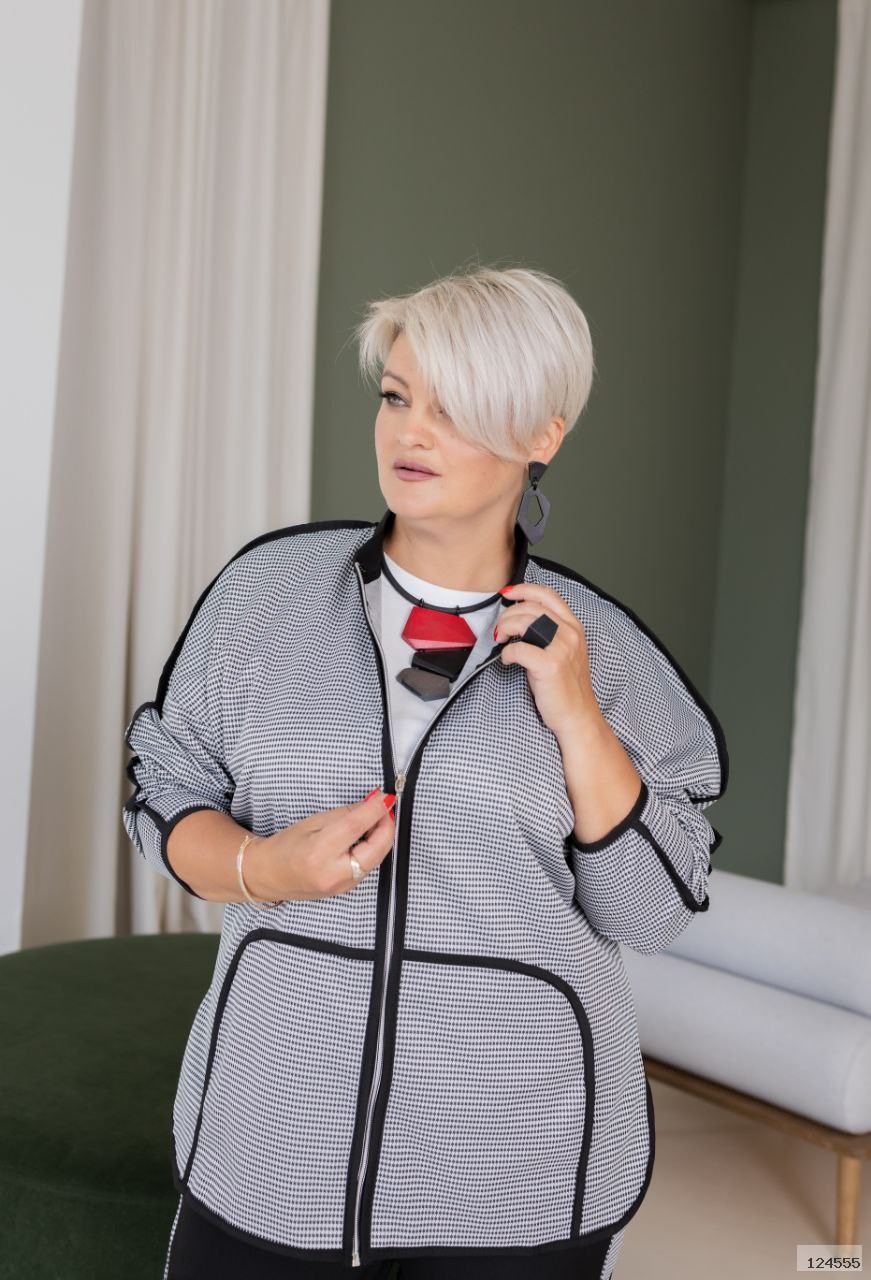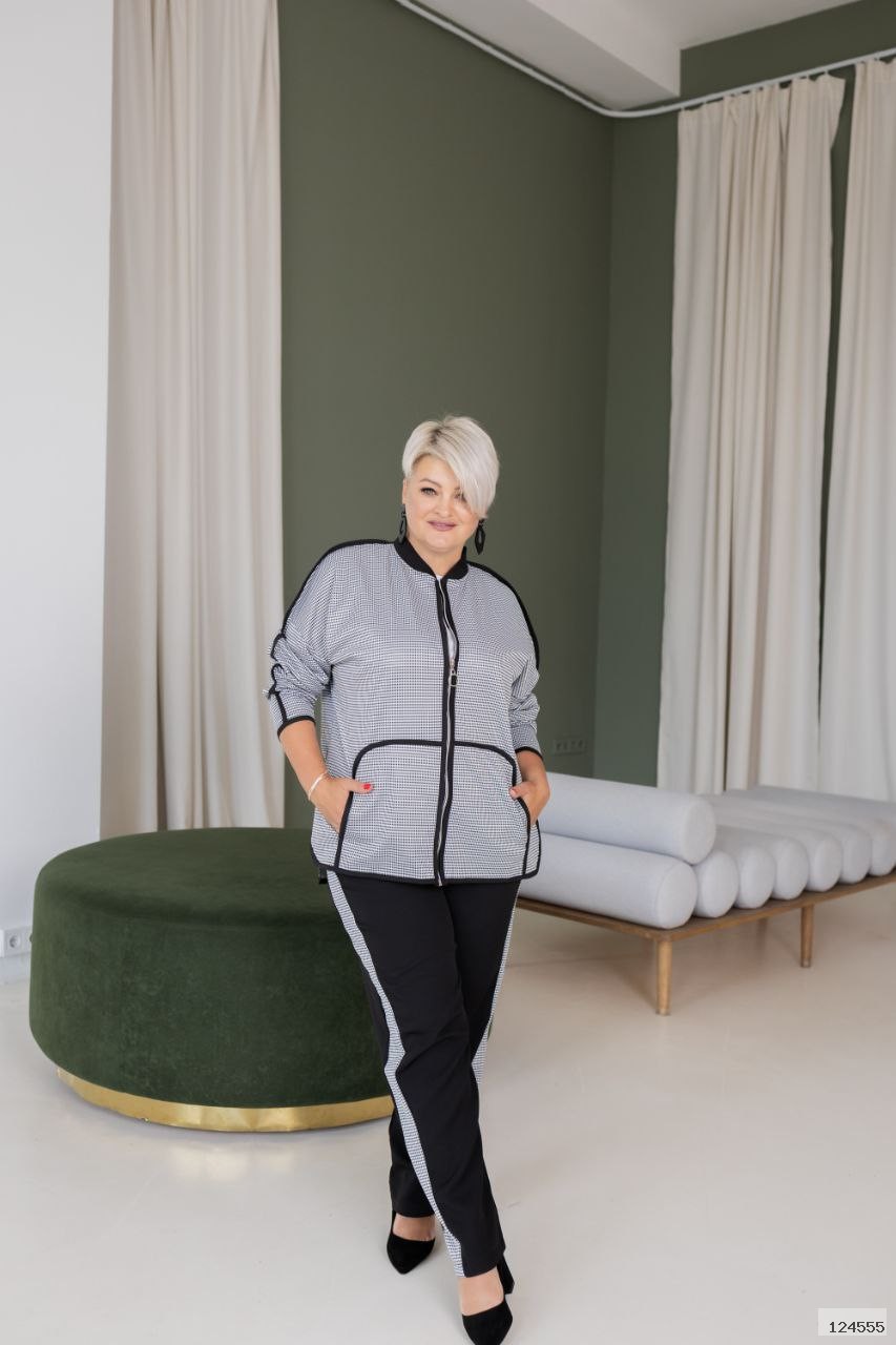 Стильний костюм з актуальним принтом "лапка", кофтинка на блискавиці, забезпечує комфорт. Чорна окантовка створює контраст. Штани- еластичний пояс на резинці, бокова вставка подовжує ніжку.