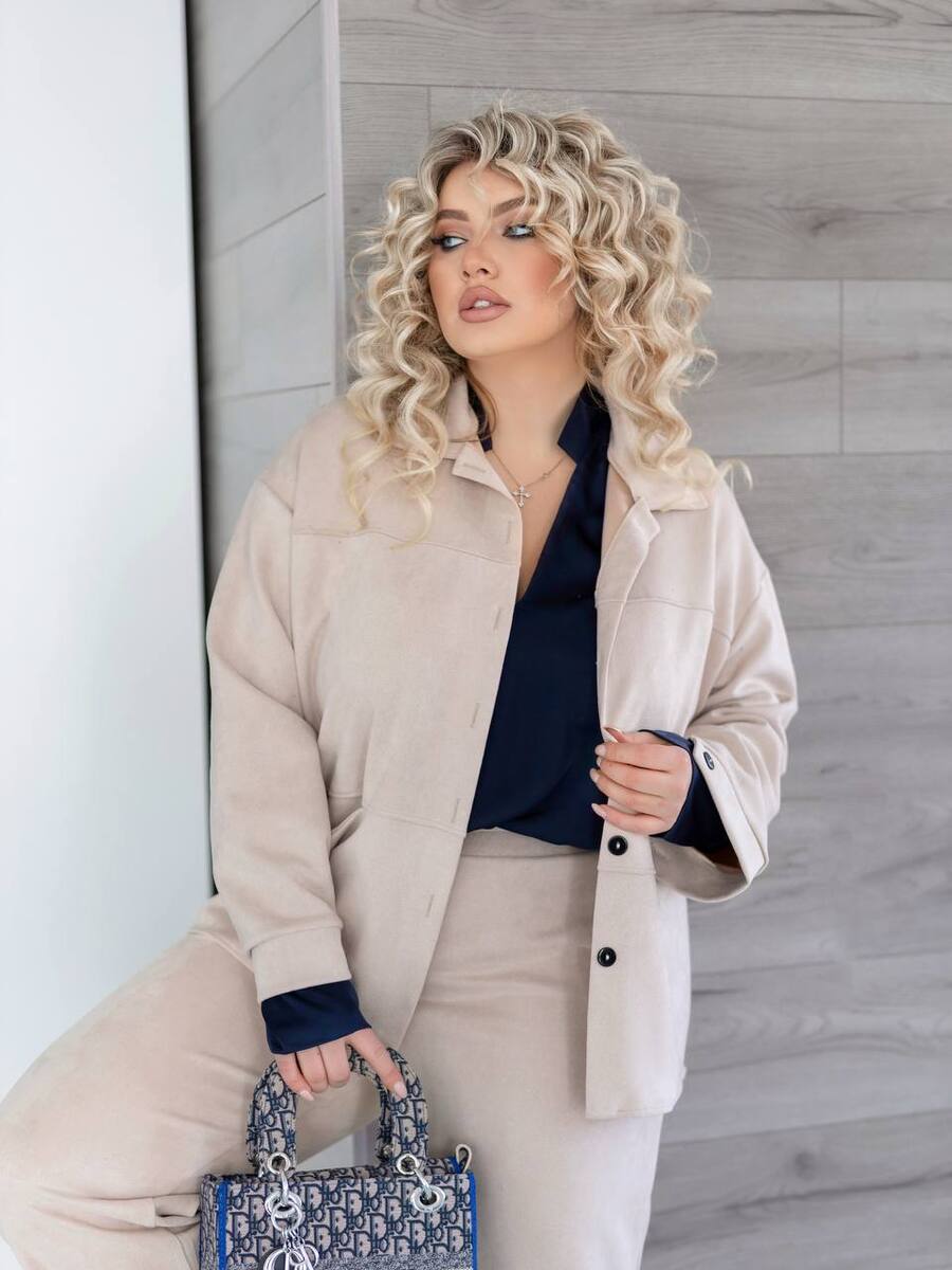 Стильний костюм двійка із замшу. На куртці позаду декор ґудзик. Штани прямі