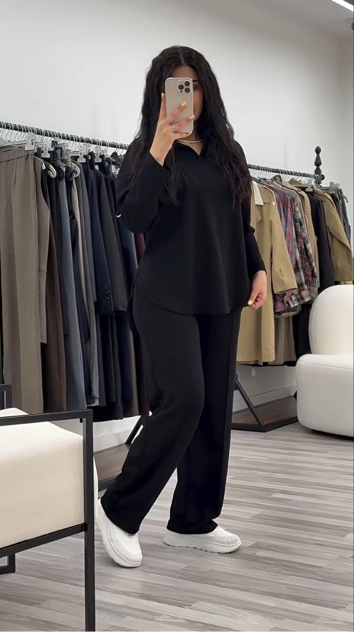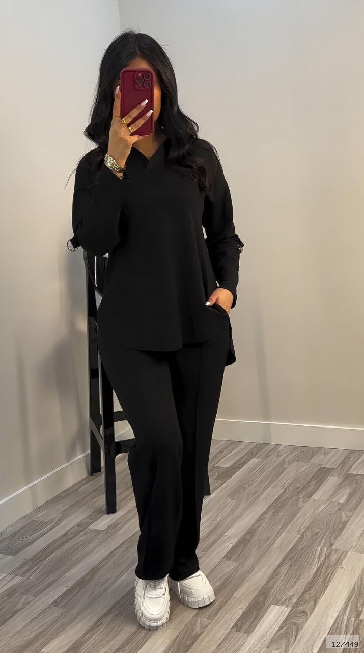 Штани на резинці, з високою посадкою. Універсальний дизайн — під кросівки, лофери чи підбори. Рукава в сорочці регулюються патами, що дає можливість легко перетворити рукав повної довжини на рукав 3/4. Приємна до тіла тканина, має розтяжність.