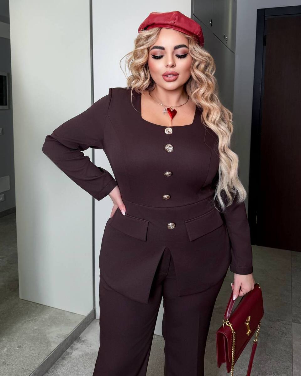 Костюм-двійка : блуза з округленим низом , ряд ґудзиків на ніжці , кишені-клапани ( імітація) , довгий рукав, П-образний виріз , штани на ґудзику та молнії, ззаду на резинці, з боків кишені. Ідеальний варіант , як для офісного та нарядного стилю.