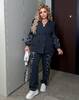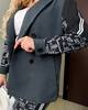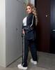 Костюм-двійка цікавого крою : на рукавах та штанках принтовані вставки + пришивний лампас. Жакет застібається на два ряди ґудзиків , на рукавах манжети з ґудзиками . Штани на резинці , з боків кишені .