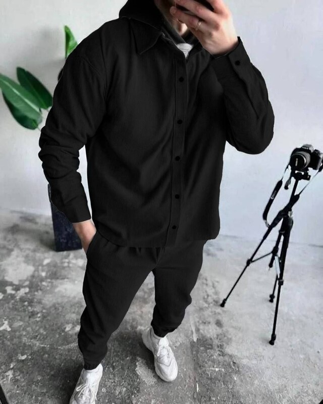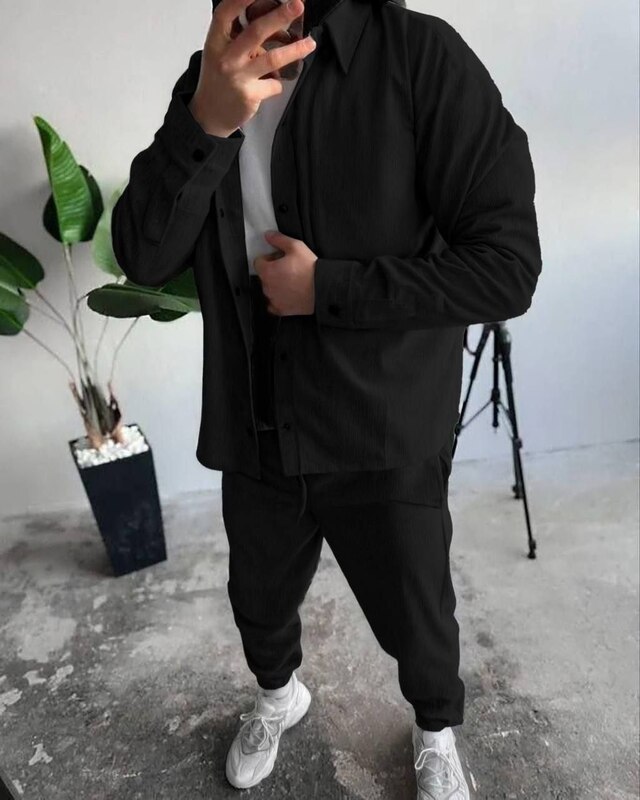 Сорочка на кнопках доповнюється стильними штанами з поясом на резинці та шнурком для ідеальної посадки,бічними кишенями та манжетами-резинками знизу.