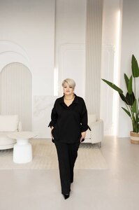 Штани на резинці, з високою посадкою. Універсальний дизайн — під кросівки, лофери чи підбори. Рукава в сорочці регулюються патами, що дає можливість легко перетворити рукав повної довжини на рукав 3/4. Приємна до тіла тканина, має розтяжність.