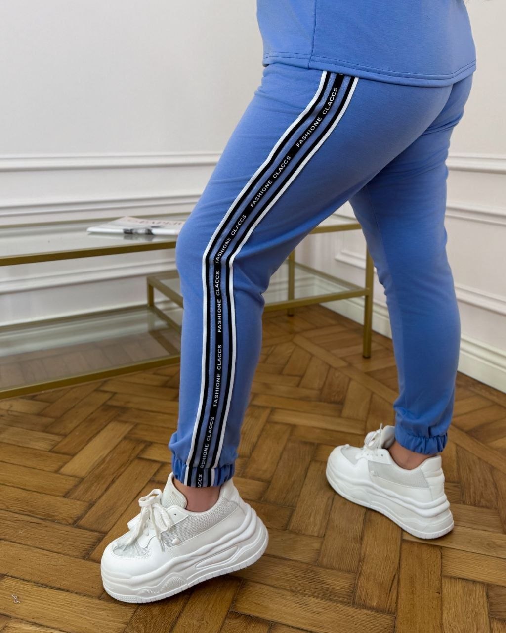 Весняно-літній костюм, футболка + штани, футболка з коротким рукавом і лампасами по рукавах. Штани джогери з кишенями на гумці, в поясі є шнурок, внизу манжета, лампаси з боків.