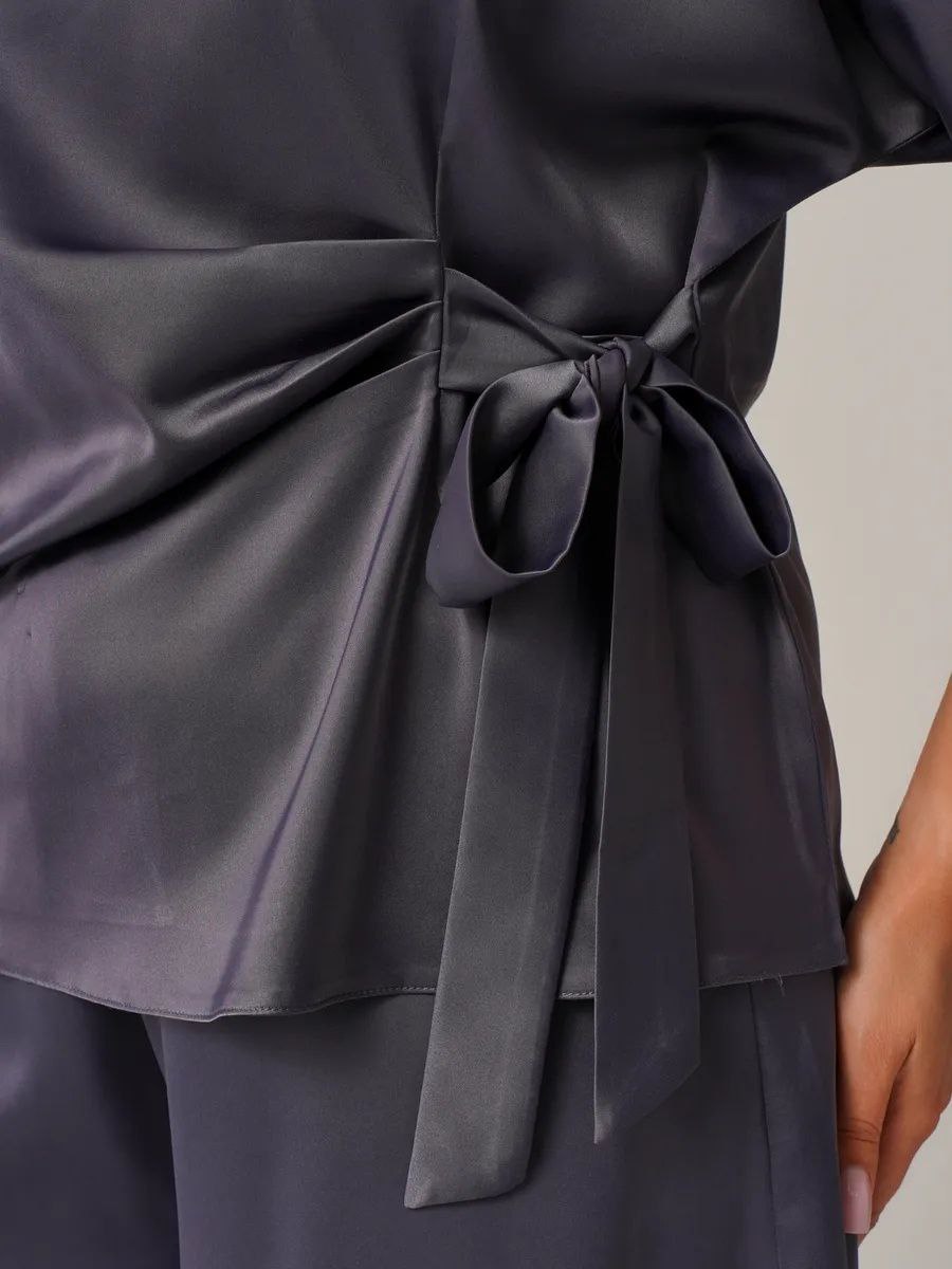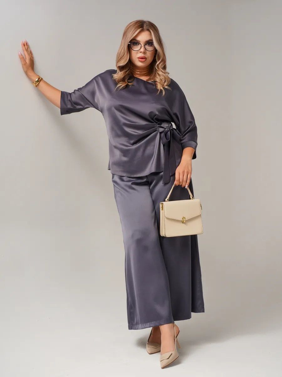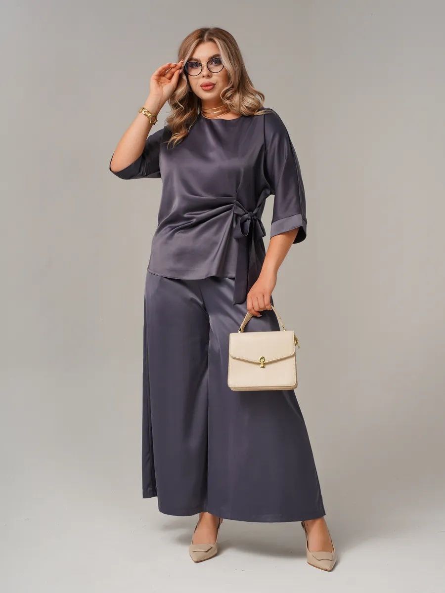 Комфортний, універсальний і дуже ефектний костюм, як для повсякденного образу, так і для особливих подій. Блуза з асиметричною зав’язкою формує красивий силует, а широкі брюки створюють ефект витягнутої фігури, пояс на резинці.Тканина м’яко лягає по фігурі, виглядає дорого та комфортна у носінні.