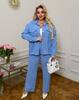 Костюм складається з сорочки-жакета на ґудзиках та зручних штанів із високою посадкою.