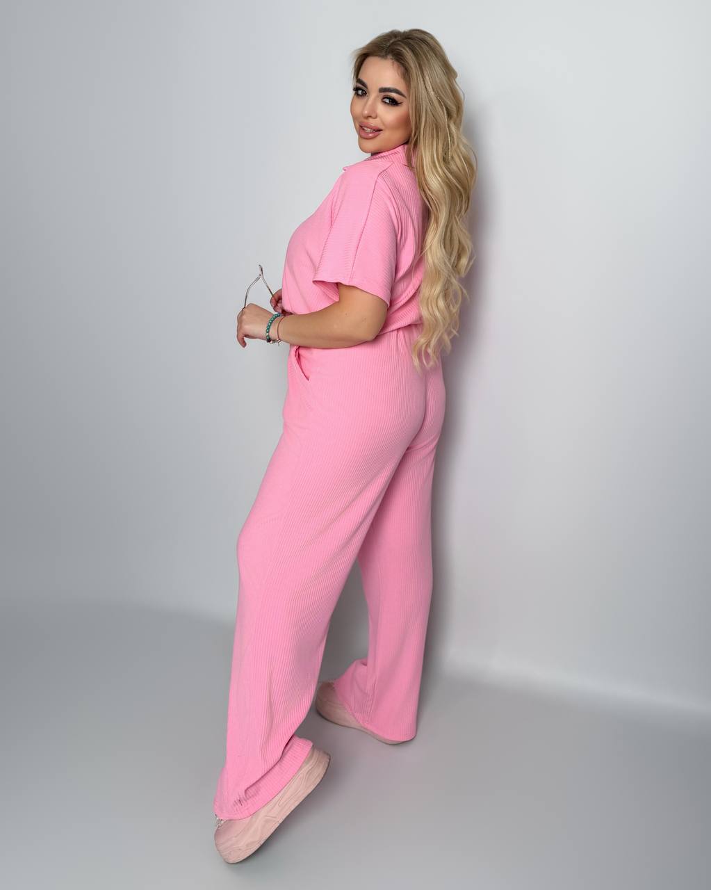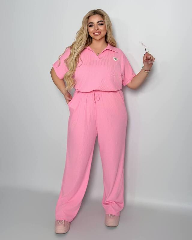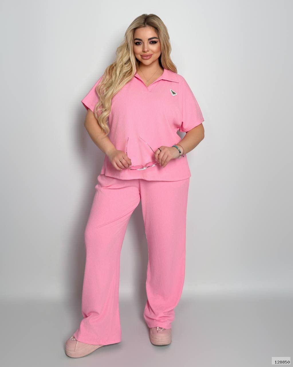 Стильний комфортний костюм “Barcelona” з трикотажу рубчик хб стрейч: футболка у стилі поло оверсайз з Акс + штани прямі розширені з високою посадкою з кішенями у бічних швах, з куліскою на поясі