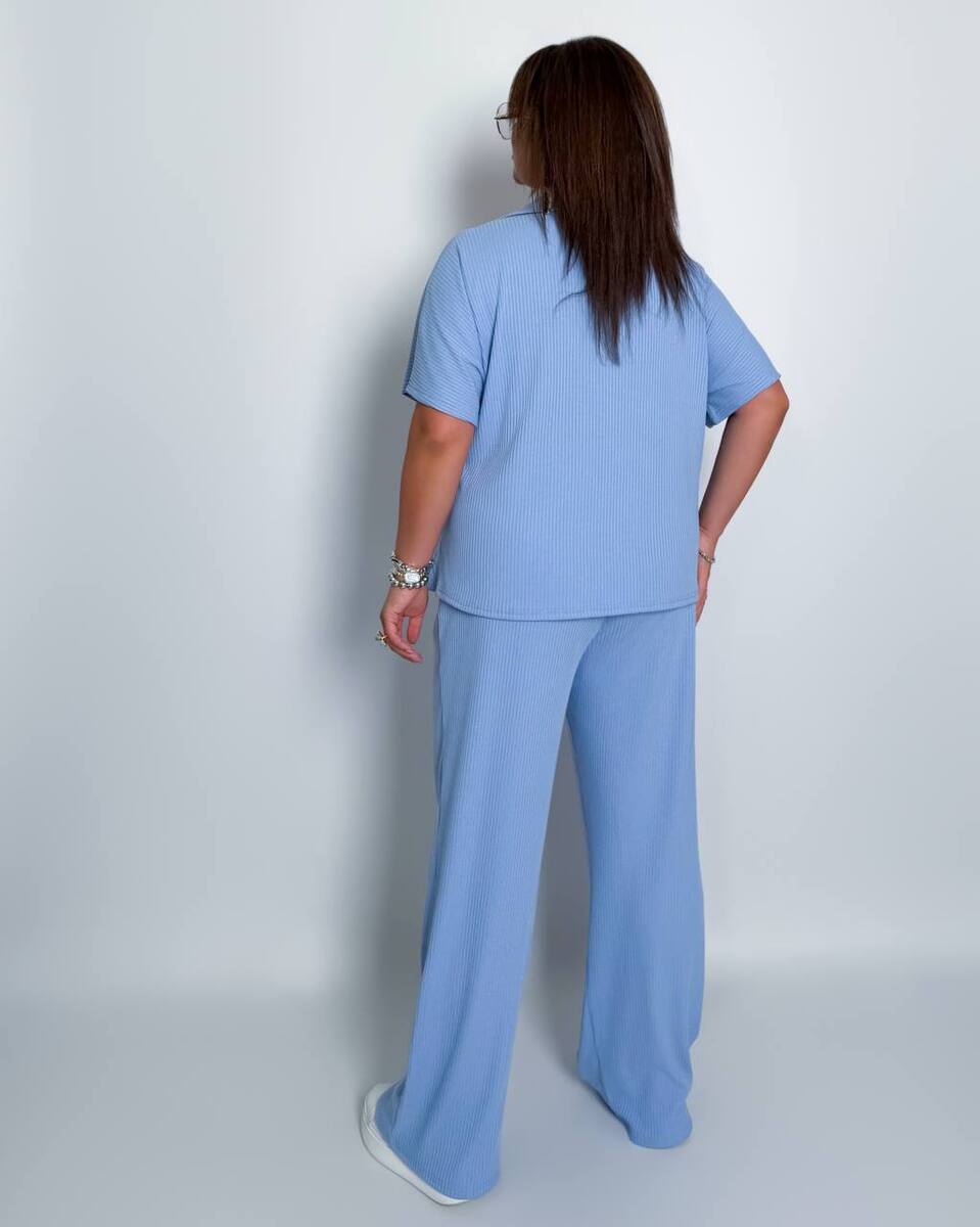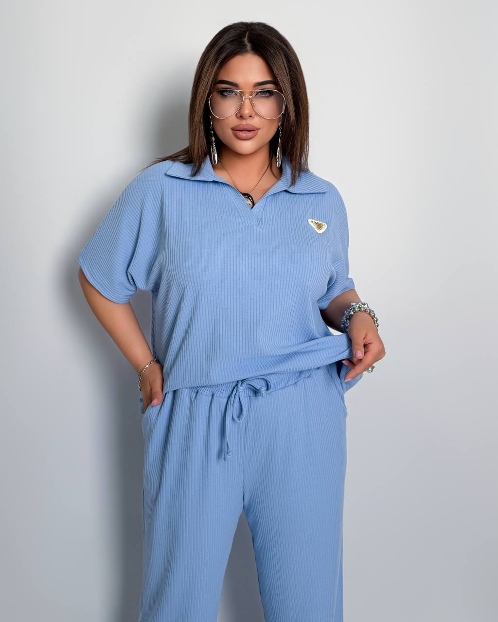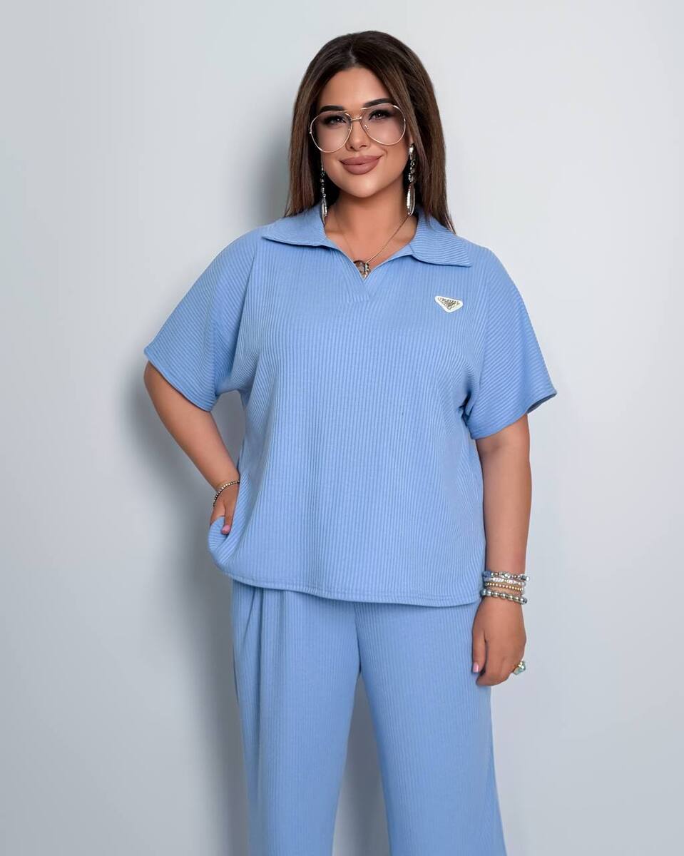 Стильний комфортний костюм “Barcelona” з трикотажу рубчик хб стрейч: футболка у стилі поло оверсайз з Акс + штани прямі розширені з високою посадкою з кішенями у бічних швах, з куліскою на поясі