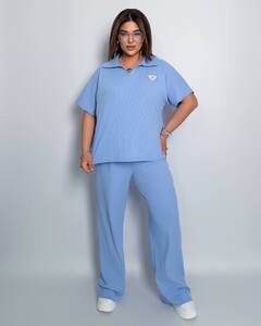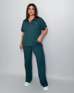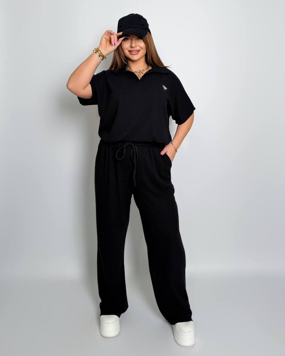 Стильний комфортний костюм “Barcelona” з трикотажу рубчик хб стрейч: футболка у стилі поло оверсайз з Акс + штани прямі розширені з високою посадкою з кішенями у бічних швах, з куліскою на поясі