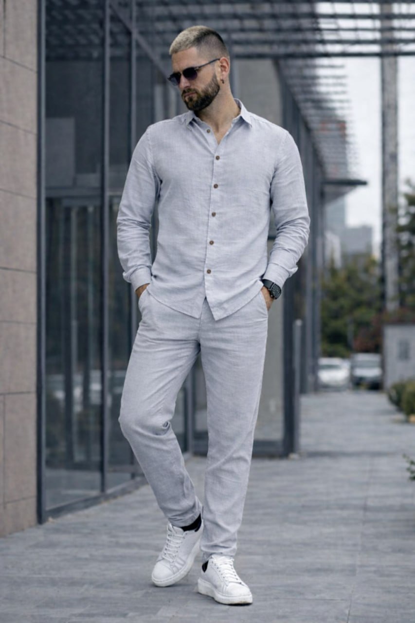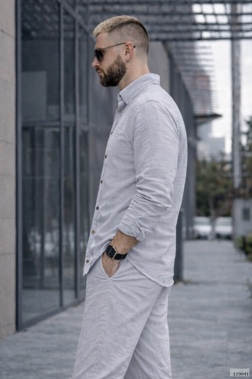 Стильний чоловічий костюм — ідеальний варіант для літа. Комплект складається з легкої сорочки та зручних брюк. Виконаний із натуральної тканини льон бохо, що добре пропускає повітря та забезпечує комфорт навіть у спеку. Сорочка з довгим рукавом, на ґудзиках, має сучасний мінімалістичний крій. Брюки прямого крою з комфортною посадкою та еластичним поясом.