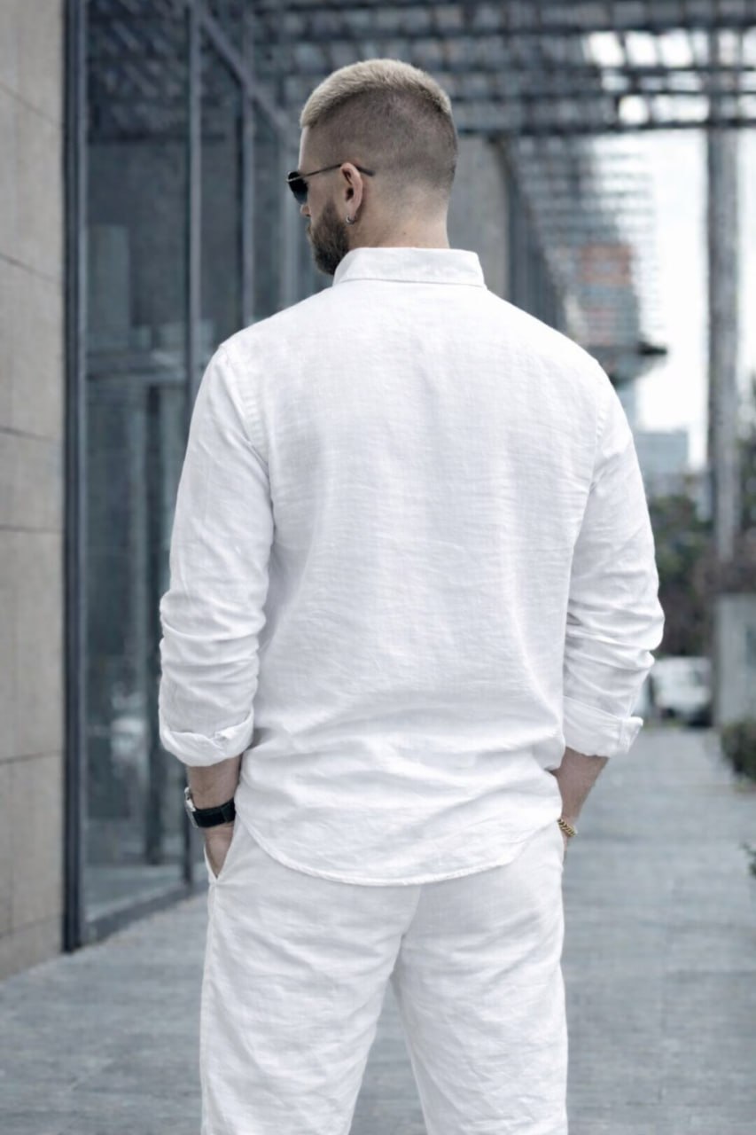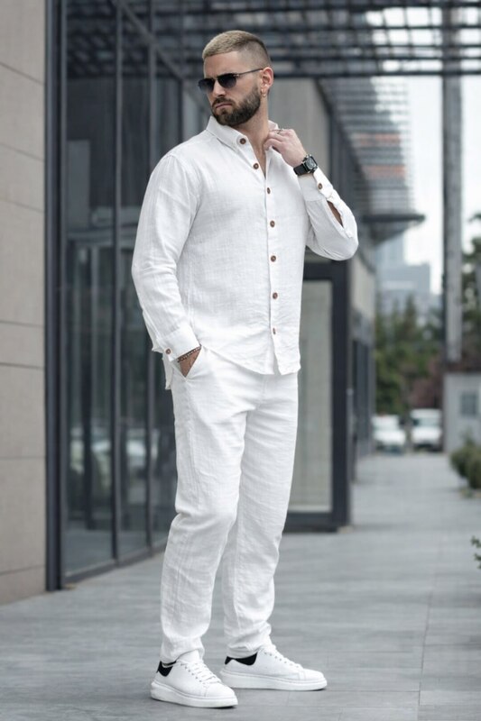 Стильний чоловічий костюм — ідеальний варіант для літа. Комплект складається з легкої сорочки та зручних брюк. Виконаний із натуральної тканини льон бохо, що добре пропускає повітря та забезпечує комфорт навіть у спеку. Сорочка з довгим рукавом, на ґудзиках, має сучасний мінімалістичний крій. Брюки прямого крою з комфортною посадкою та еластичним поясом.