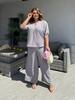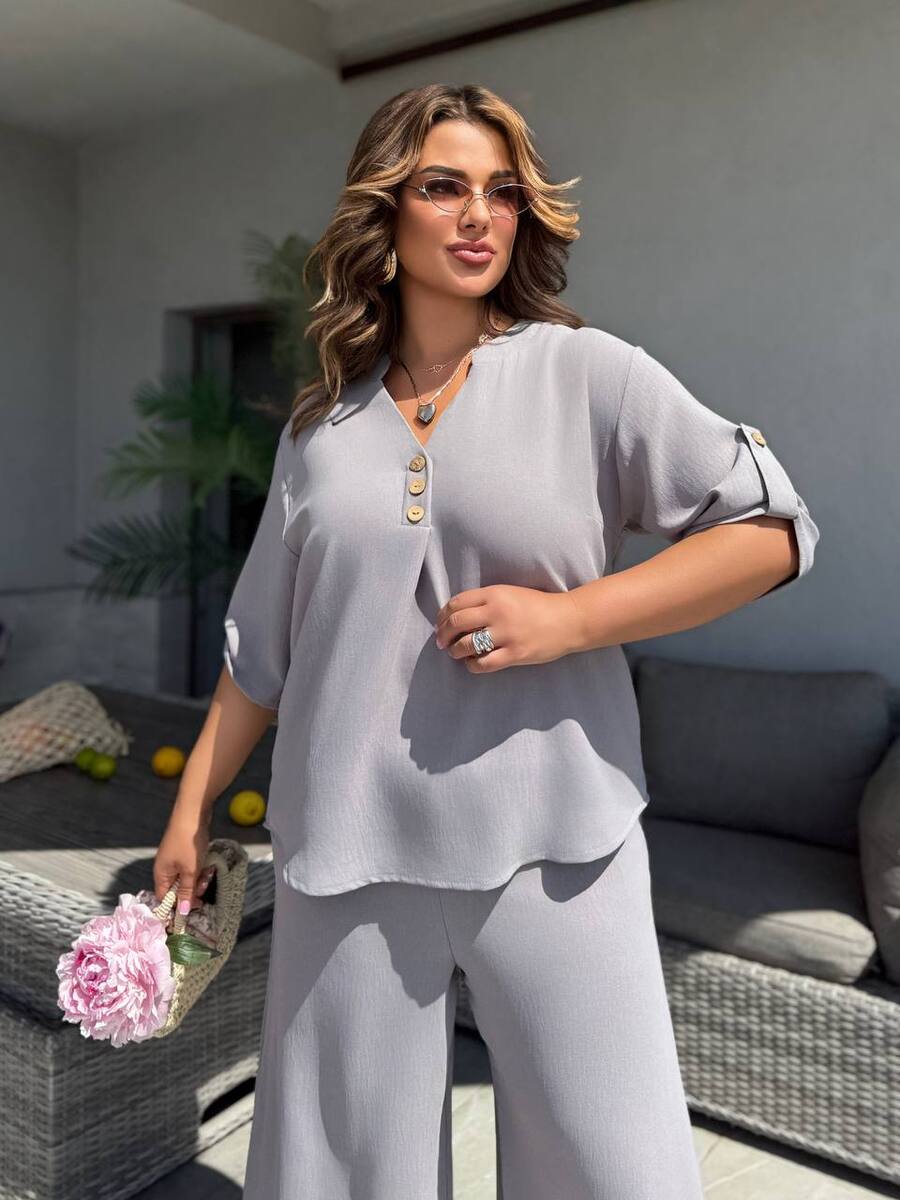 Штани палаццо вільного крою мають бічні кишені та резинку на талії, футболка вільного крою декорована ґудзиками, довжина рукава регулюється