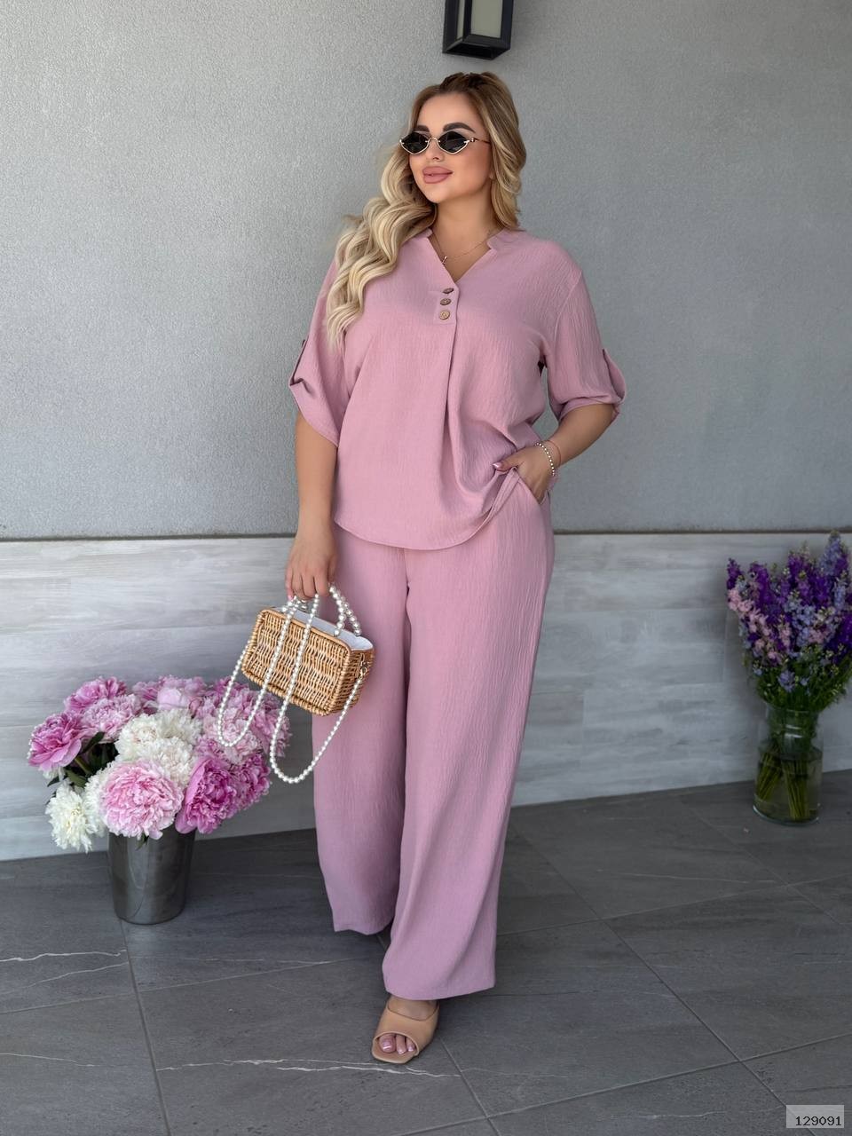 Штани палаццо вільного крою мають бічні кишені та резинку на талії, футболка вільного крою декорована ґудзиками, довжина рукава регулюється