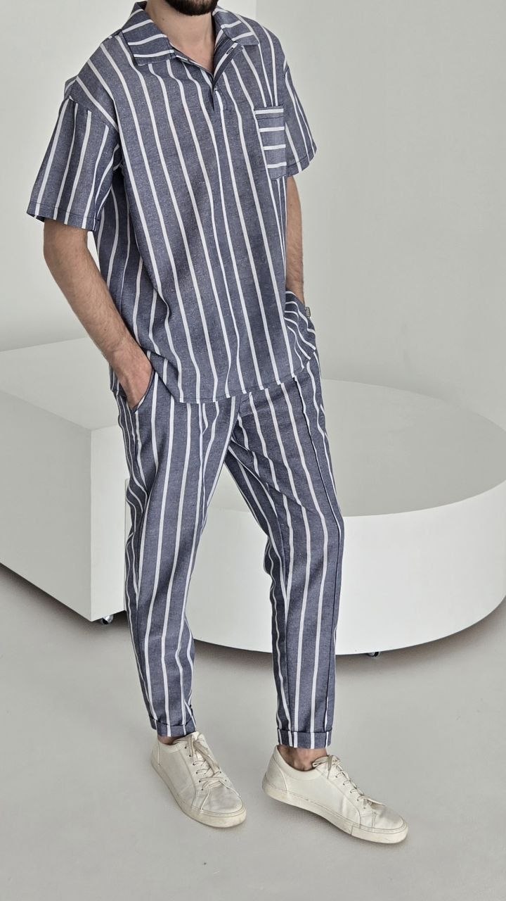Сорочка з комірцем та накладною кишенею.Штани з еластичним поясом і шнурком.