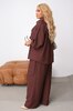 Вишуканий костюм, що поєднує комфорт, практичність і сучасний дизайн. Ідеальний вибір для повсякденних образів, роботи або стильних виходів — виглядає легко, але водночас елегантно.Сорочка вільного крою з накладними кишенями, декорованими клапанами зі стрічками, які плавно переходять до низу виробу та додають образу оригінальності. Перед оздоблений делікатними складками (“гармошкою”) в зоні грудей, що створює м’який, жіночний акцент.Застібається на ґудзики, рукав 3/4 із фіксацією на ґудзик — зручно та практично для щоденного носіння.Штани вільного крою з високою посадкою та еластичною резинкою на поясі забезпечують комфорт протягом усього дня. Бічні кишені додають практичності, а легкий силует виглядає сучасно та невимушено.Костюм легко комбінується як із класичним взуттям, так і з casual-варіантами — універсальна база гардероба.