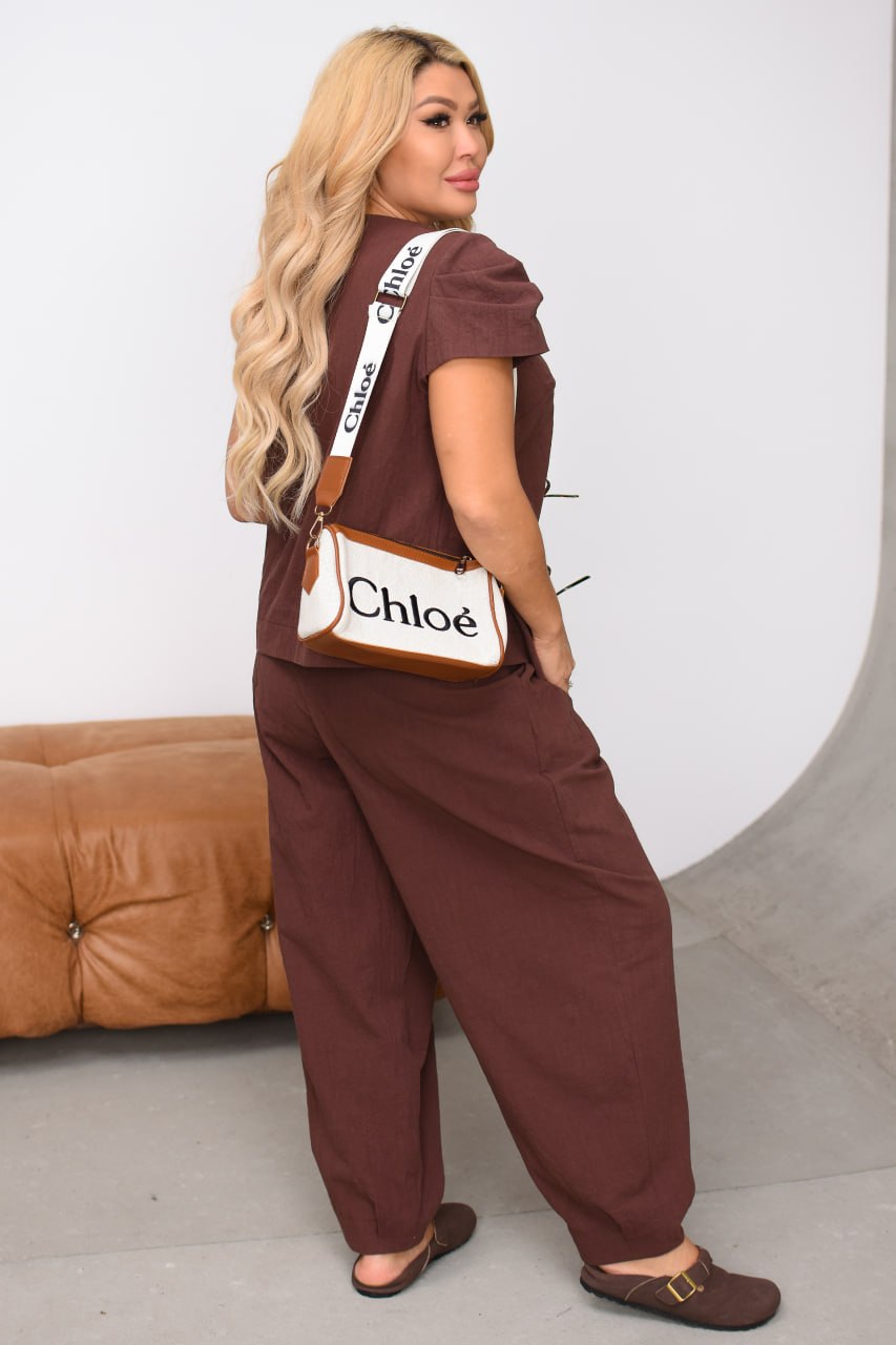 Вишуканий брючний костюм, який гармонійно поєднує жіночність, комфорт і актуальний дизайн. Ідеально підходить як для офісу, так і для особливих подій — виглядає стримано, але водночас ефектно. Жакет вільного крою з коротким рукавом зі складками, м’яко прилягає до руки та формує акуратний об’єм. Особливий акцент — декоративні застібки-бантики, що створюють ніжний, елегантний настрій, при цьому під верхнім бантом прихований робочий ґудзик для зручності. Штани із середньою посадкою та еластичною резинкою ззаду на поясі забезпечують комфорт протягом усього дня. Вільна штанина з декоративними защипами внизу формує акуратний силует, а укорочена довжина виглядає сучасно та стильно.