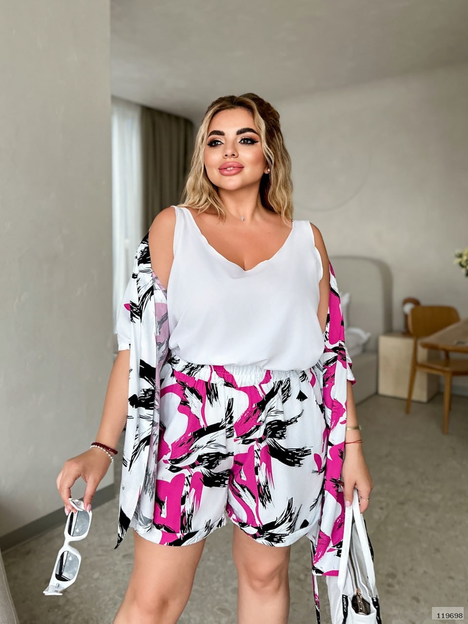 (54-56) халат: ОГ 132, ОТ 124, ОБ 132, рукав від ворота 38, довжина 76. Майка: ОГ 124, ОТ 118, довжина 59. Шорти: гумка 88-108, ОБ 122, довжина 43.
