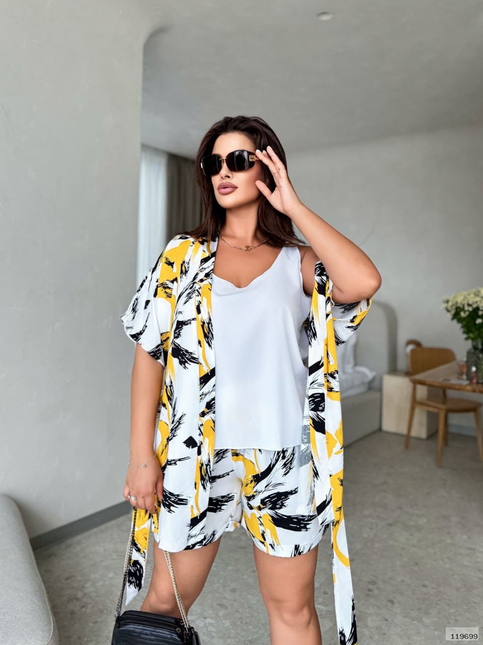 (50-52) халат: ОГ 120, ОТ 112, ОБ 120, рукав від ворота 37, довжина 75. Майка: ОГ 116, ОТ 110, довжина 58. Шорти: гумка 82-102, ОБ 116, довжина 42.