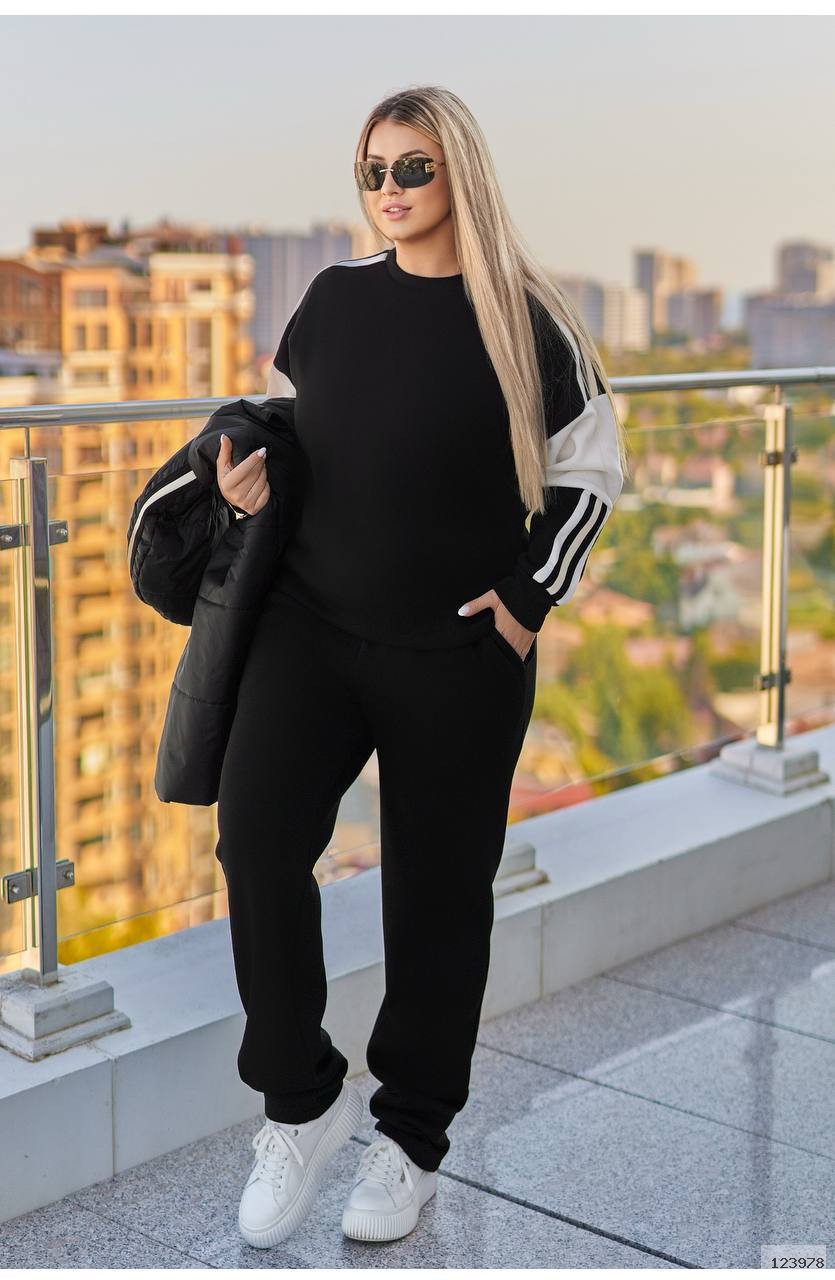 Світшот вільного крою, рукава з контрастними білими вставками прикрашені лампасною стрічкою. Штани високої посадки, з кишенями, еластичним поясом,знизу прямі.
