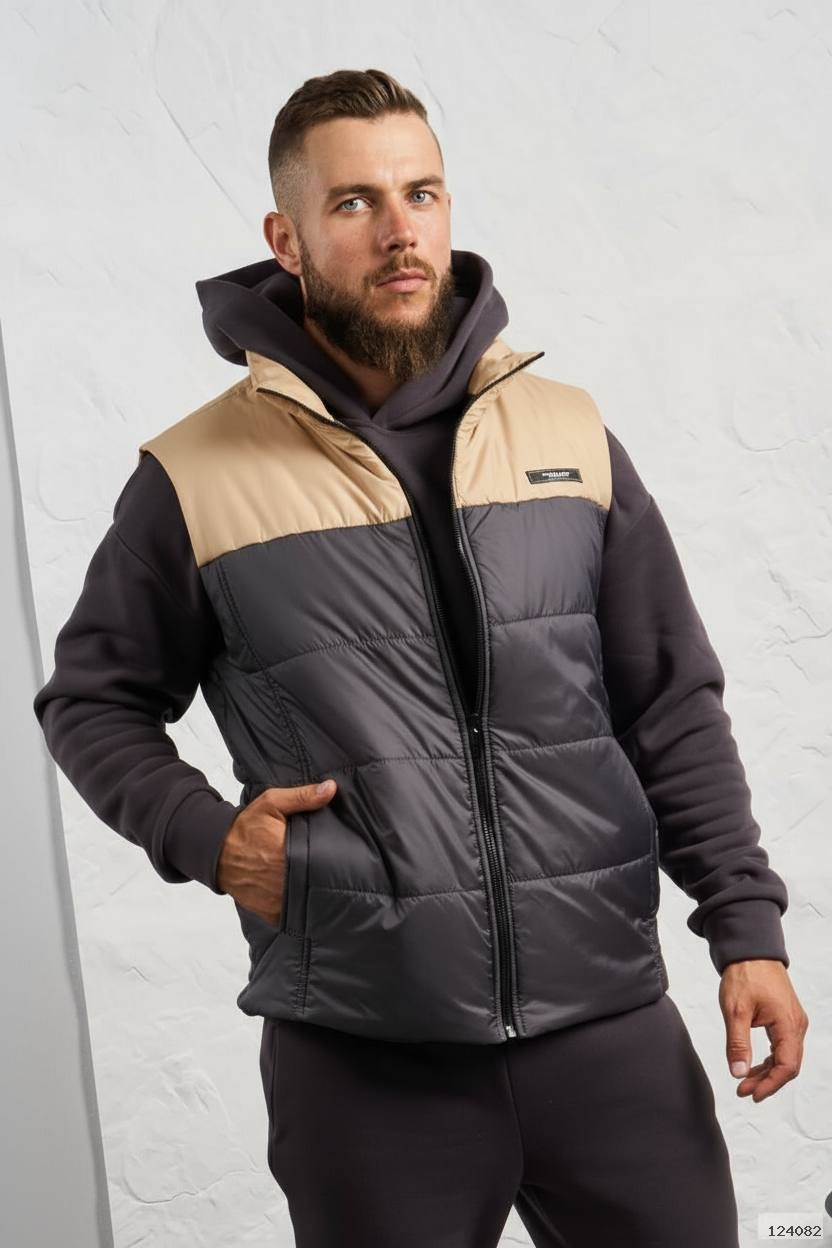 Стильний чоловічий комплект для прохолодної погоди. Складається з утепленого жилета та зручного теплого спортивного костюма, з кишенею кенгуру, збоку прикрашен нашивкою, з капюшоном. Рукава на манжетах. Штани прямі, висока посадка з кишенями, і знизу на гумці. Жилет