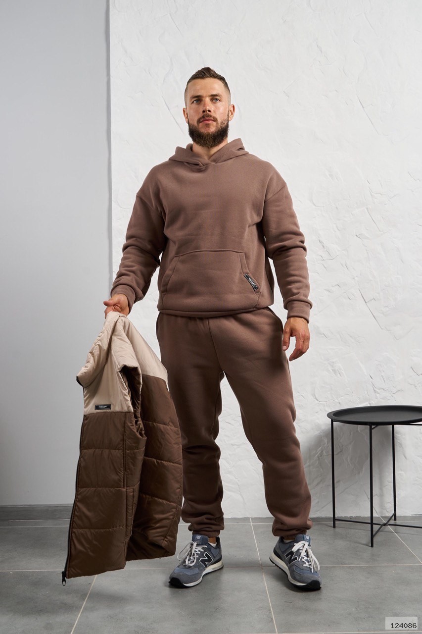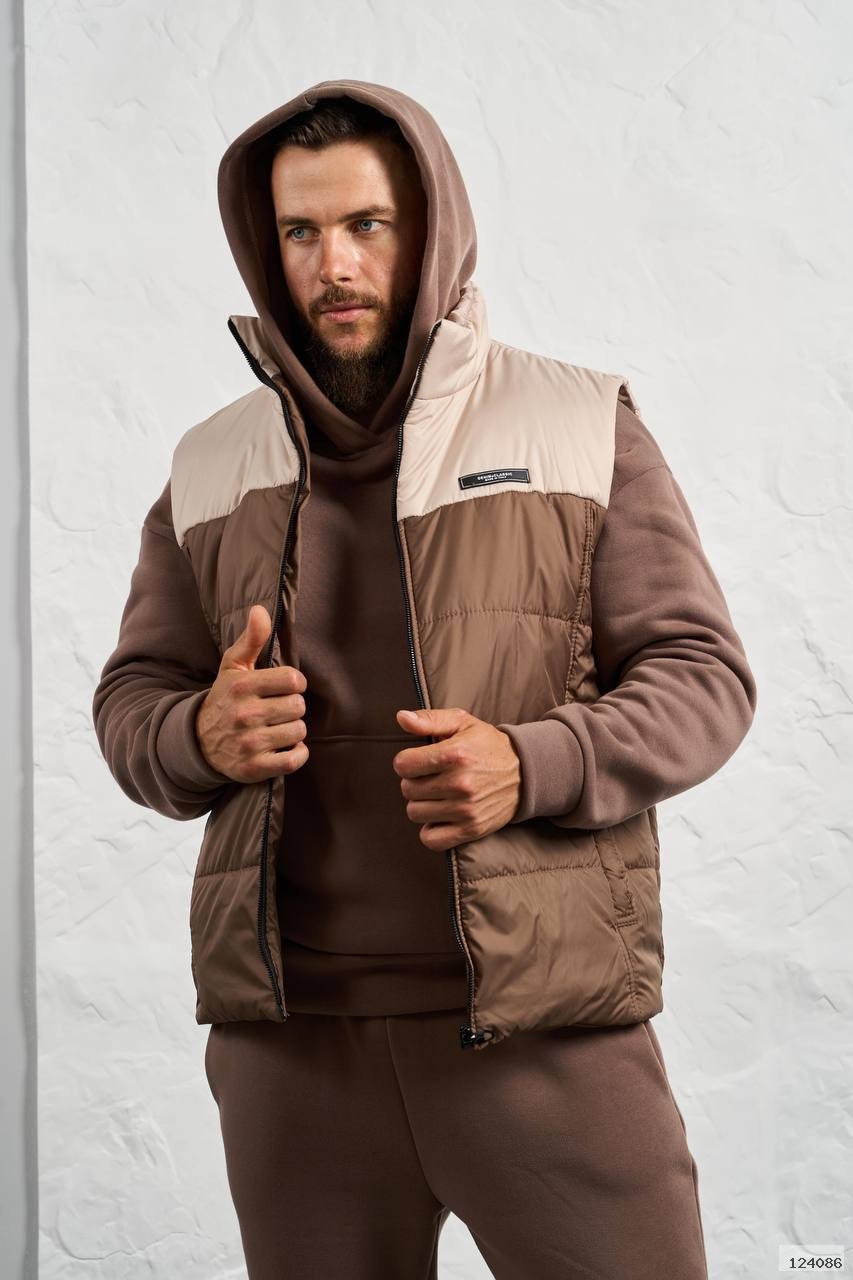 Стильний чоловічий комплект для прохолодної погоди. Складається з утепленого жилета та зручного теплого спортивного костюма, з кишенею кенгуру, збоку прикрашен нашивкою, з капюшоном. Рукава на манжетах. Штани прямі, висока посадка з кишенями, і знизу на гумці. Жилет