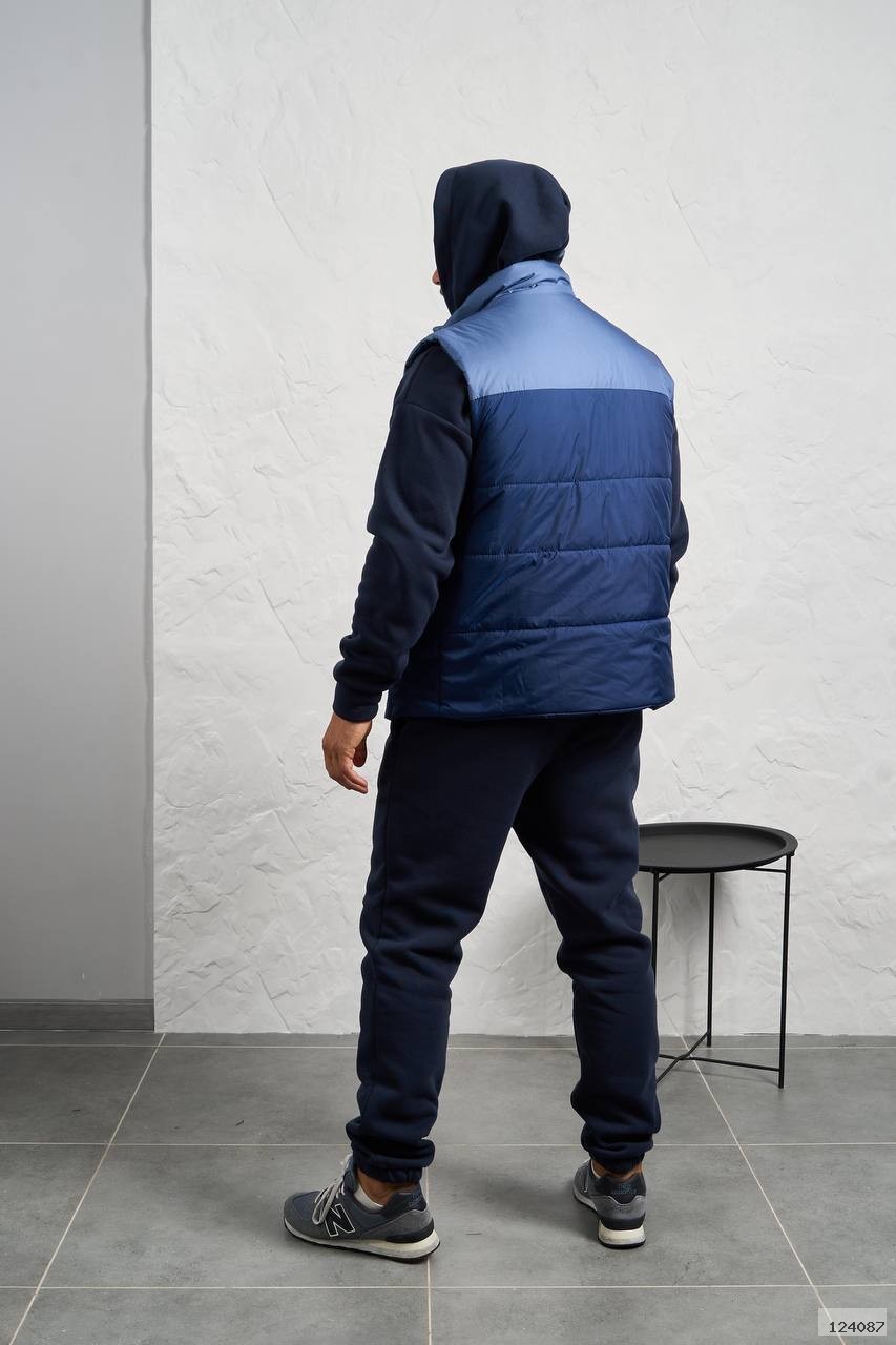 Стильний чоловічий комплект для прохолодної погоди. Складається з утепленого жилета та зручного теплого спортивного костюма, з кишенею кенгуру, збоку прикрашен нашивкою, з капюшоном. Рукава на манжетах. Штани прямі, висока посадка з кишенями, і знизу на гумці. Жилет