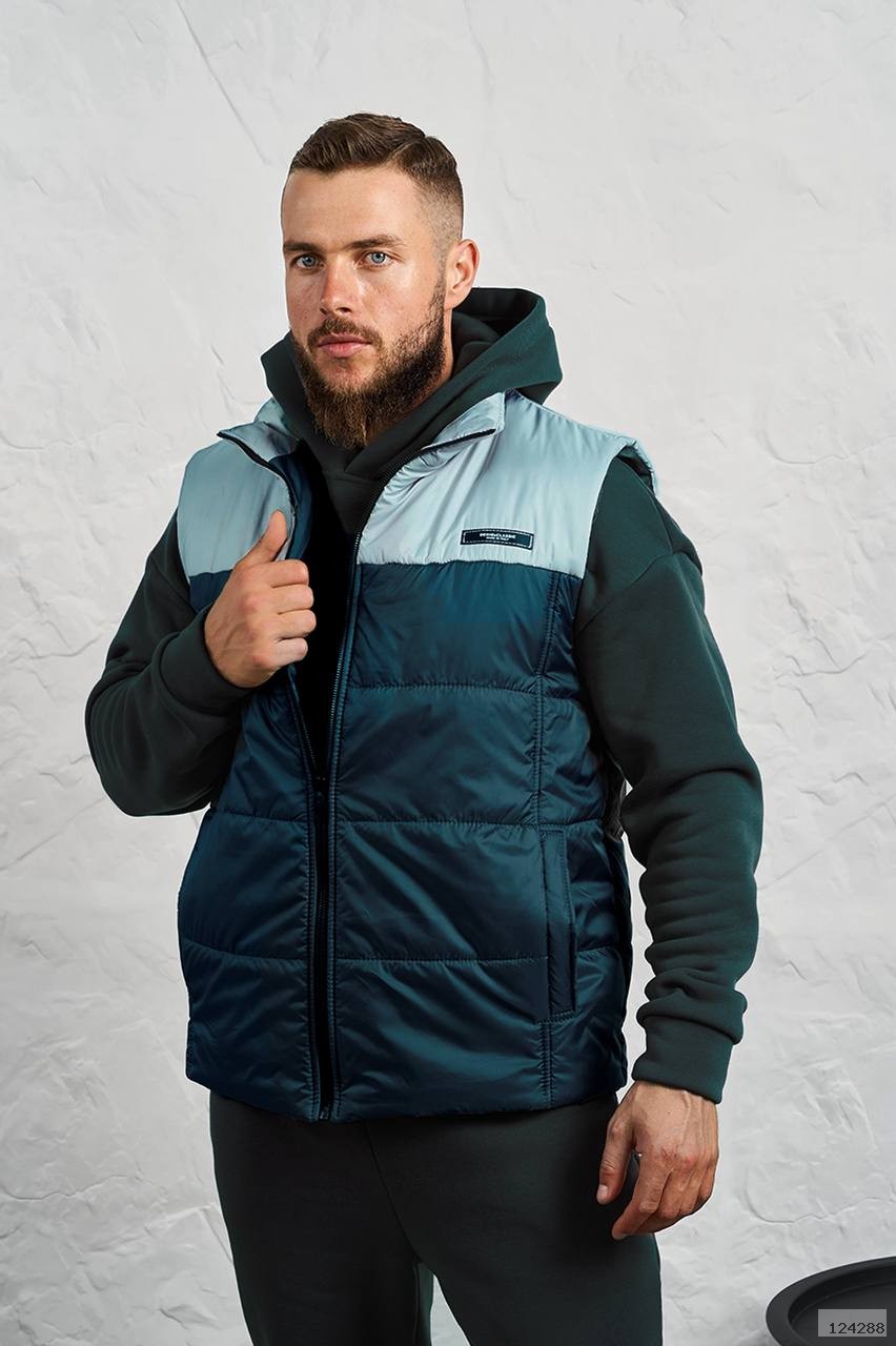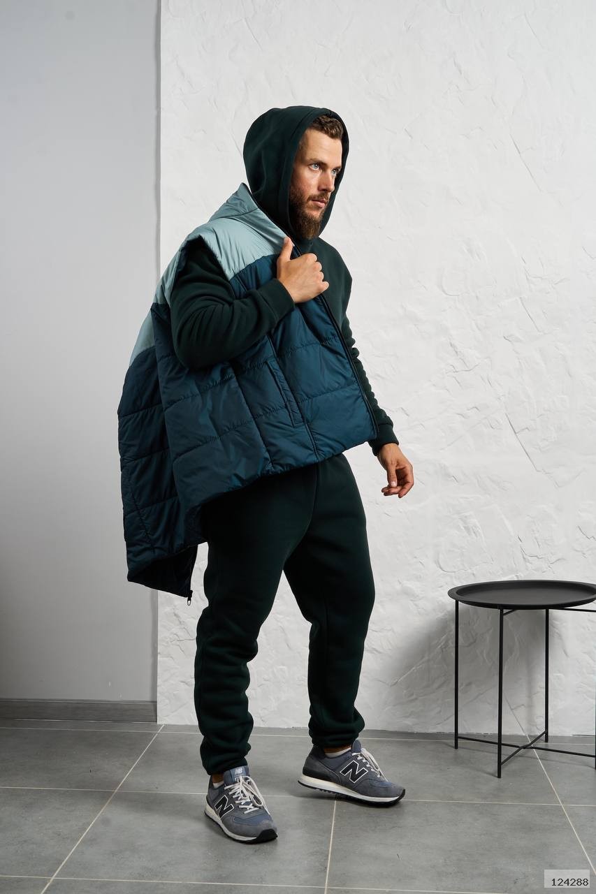 Стильний чоловічий комплект для прохолодної погоди. Складається з утепленого жилета та зручного теплого спортивного костюма, з кишенею кенгуру, збоку прикрашен нашивкою, з капюшоном. Рукава на манжетах. Штани прямі, висока посадка з кишенями, і знизу на гумці. Жилет