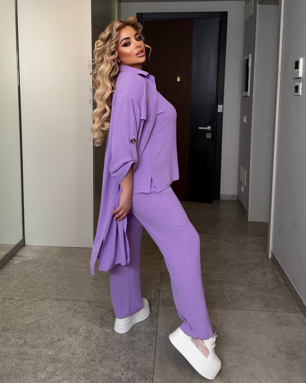 Костюм-трійка з оригинальним накатом, всі три деталі гардеробу можливо носити окремо: блуза з якісним накатом, як на фото, по низу з обох боків розрізи ; брюки на широкій резинці , з боків кишені; подовжена сорочка , застібається на ґудзики , рукав на патику с ґудзиком ( довжину можливо регулювати), на грудях неробочі кишені с ґудзиком, з боків сорочки робочі кишені.