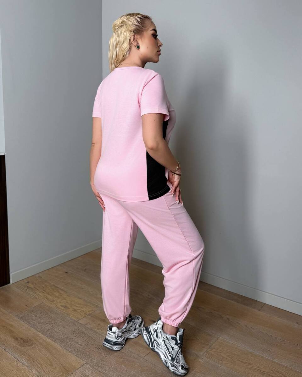 Футболка зі вставками чорної рібани по бокам ,що робить її комфортною та зменшує талію візуально.