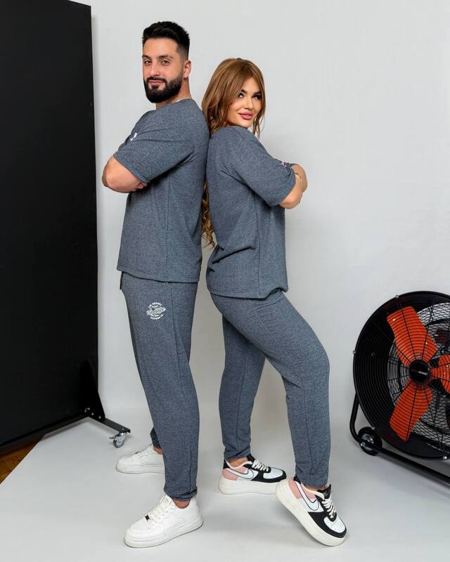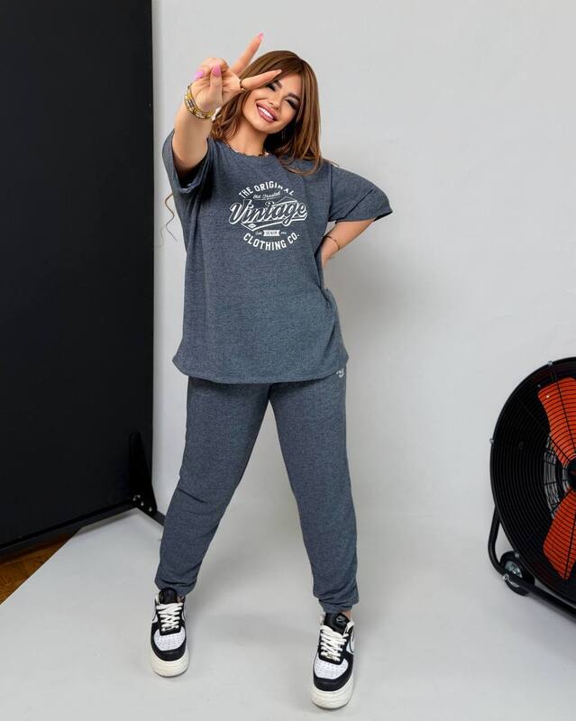 Зручний комплект,який складається з вільної футболки та штанів на резинці зі шнурком і кишенями,з резинкою внизу.