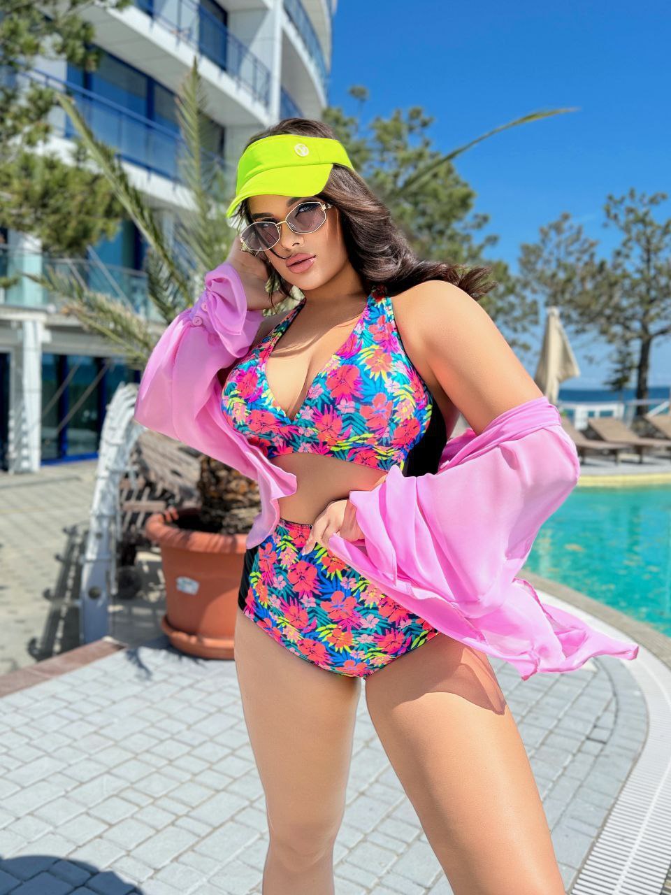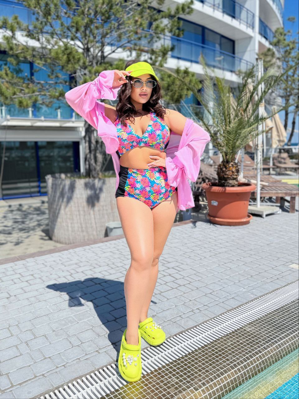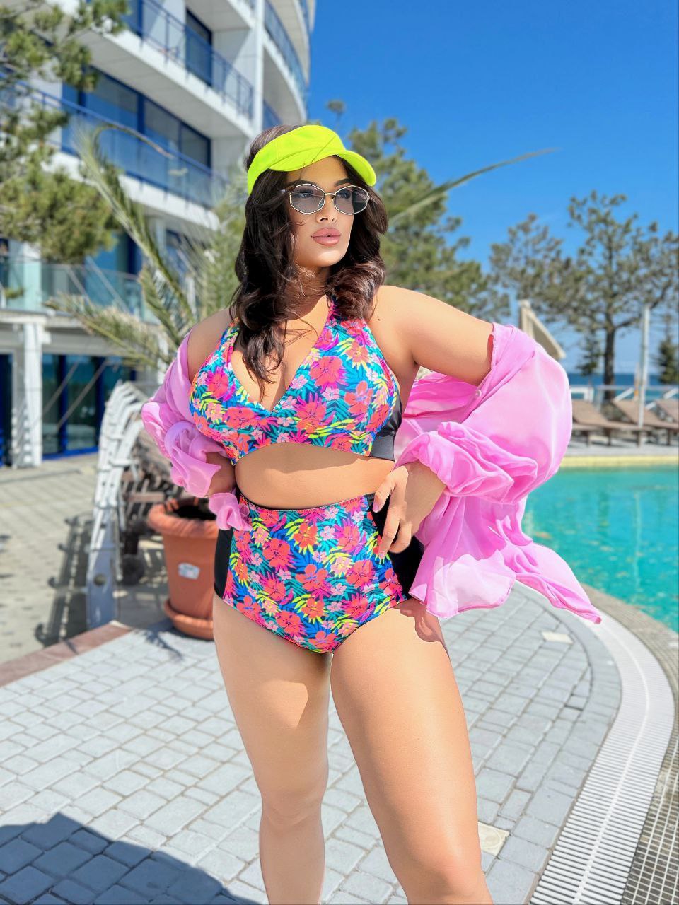 Роздільний купальник Плавки + Ліф, Плавки завищена талія, з обох боків чорні вставки, імітація утяжки, щільна гумка по талії. Ліф із зав'язками ззаду, з обох боків чорні вставки, імітація утяжки, місце під чашку, під грудьми щільна гумка.