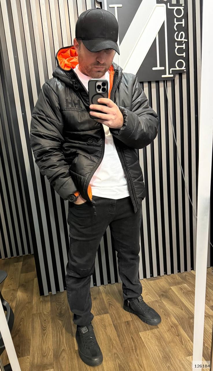 Модель застібається на блискавку та має бокові кишені також на замках. Куртка оснащена капюшоном із контрастною яскраво-помаранчевою підкладкою, що додає їй акценту та робить образ виразнішим.