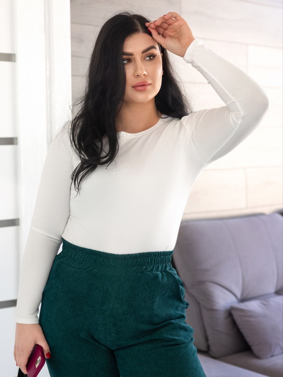 Лонгслів гарно облягає фігуру, підкреслюючи силует та не сковуючи рухи