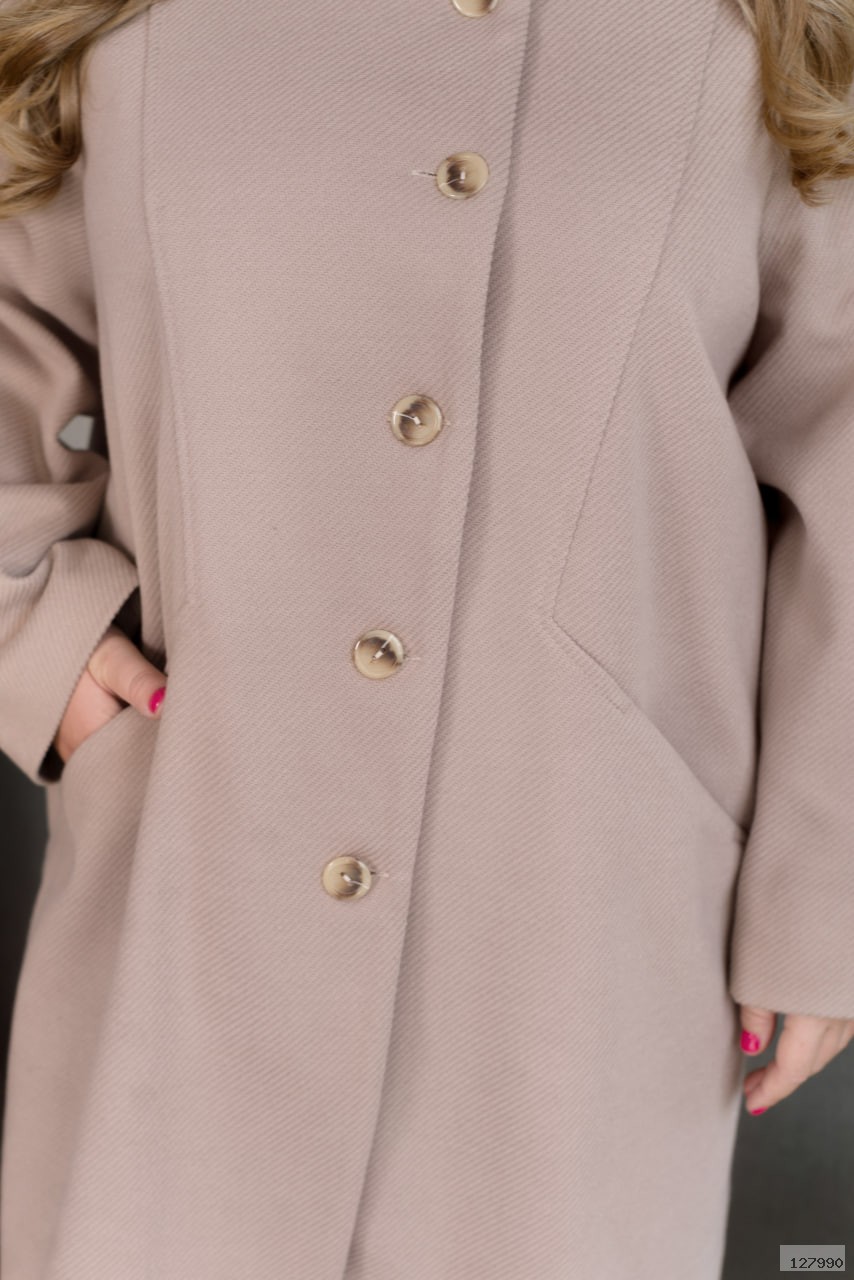 Вільний крій дарує легкість і свободу рухів, а комір-стійка додає образу елегантної стриманості. Стильний декоративний шов підкреслює силует і надає особливого шарму. Довгі рукава створюють гармонійний баланс, а зручні кишеньки та класична застібка на ґудзики роблять пальто не лише красивим, а й неймовірно практичним.